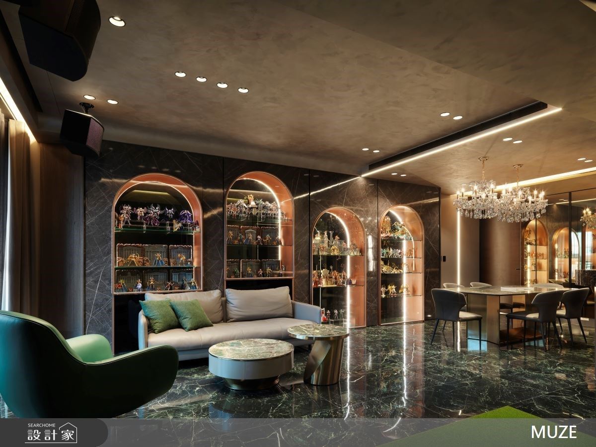 緊鄰餐廳的多功能室,在俐落的鍍金外框下,鑲嵌透視感十足的玻璃材質,為公領域創造寬敞放大的延伸感,也能視情況所需,放下內部窗簾照顧隱私性。