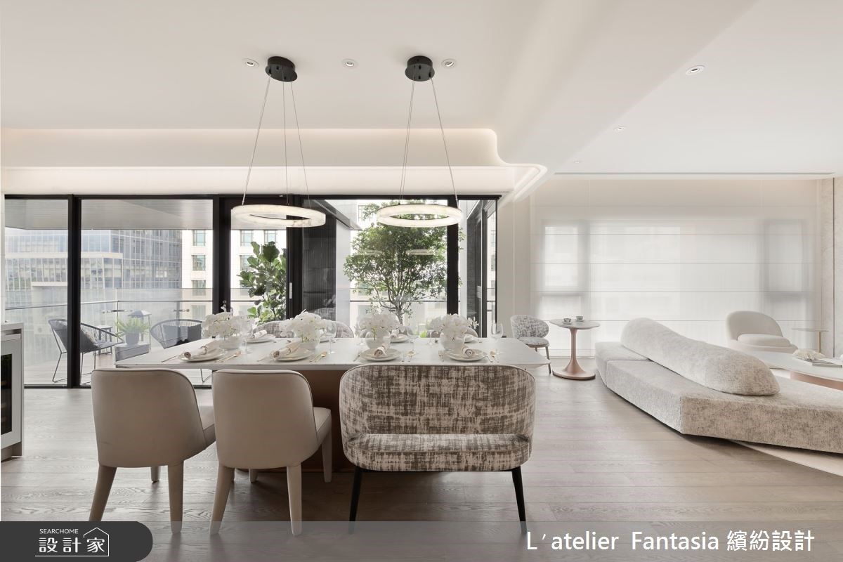 格局採全開式公共空間,廚房、客廳、餐廳形成黃金三角,滿足男主人對空間最大的要求 : 聚會交流無死角。材質上多為接近原始的素材,如 : 石紋、木質、生鐵、混凝土、玻璃磚、不鏽鋼,少許的加工,營造「裸」空間的概念。