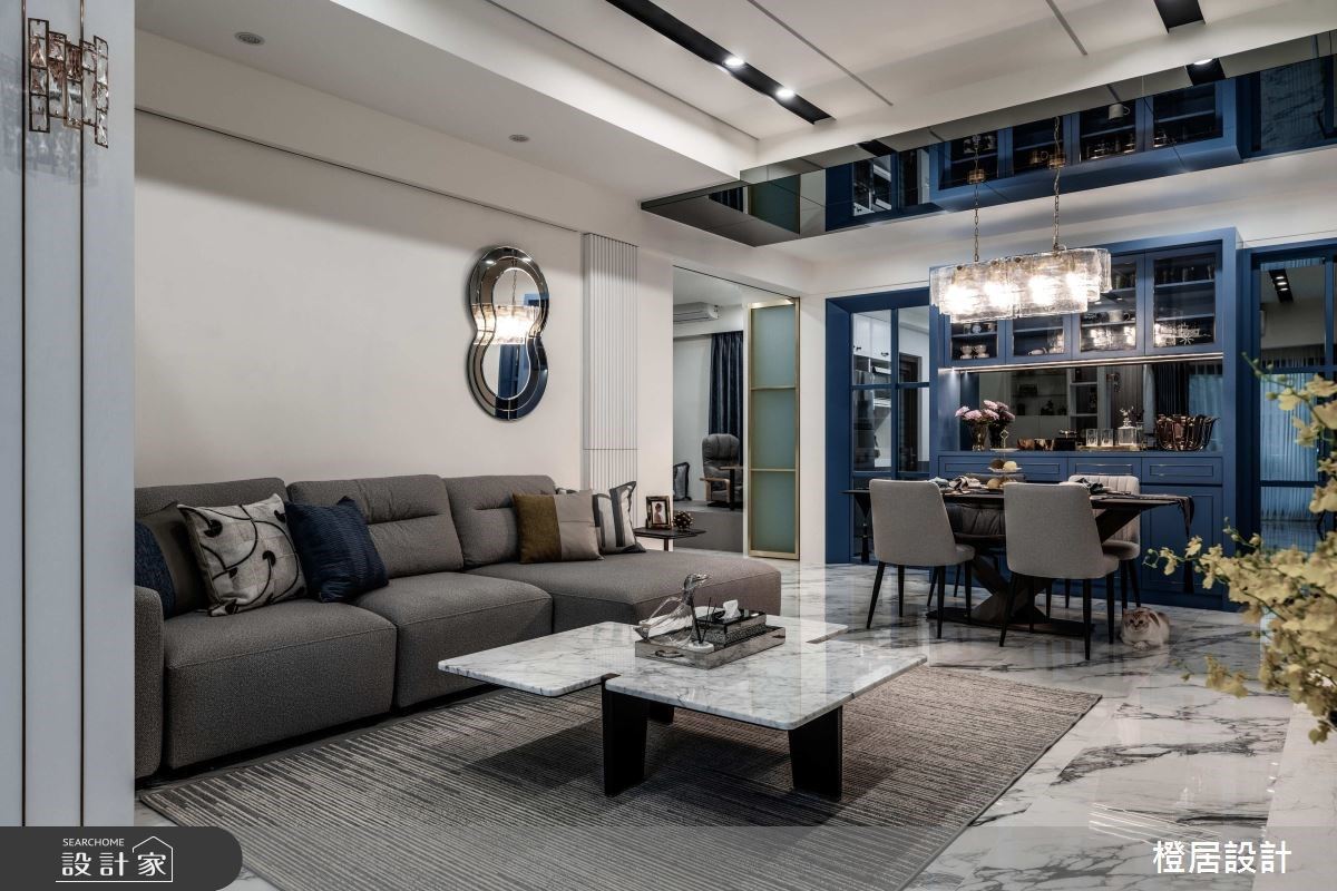 入門玄關處鋪陳清新的水磨石磁磚,明確落塵區之分野,量體造型收納櫃結合鏤空屏風,不僅消弭了風水疑慮更滿足一家人收納鞋履的需求,邁入公領域,大尺度的L型收納牆面串起公領域間的連結,輕淺白與木紋色交織,豐富了立面的層次變化,而活動式電視牆更讓藏書、影視機能更加彈性;其次餐廚空間以鮮豔的倫敦藍色,讓浴廁及廚房的門片化身視覺亮點。