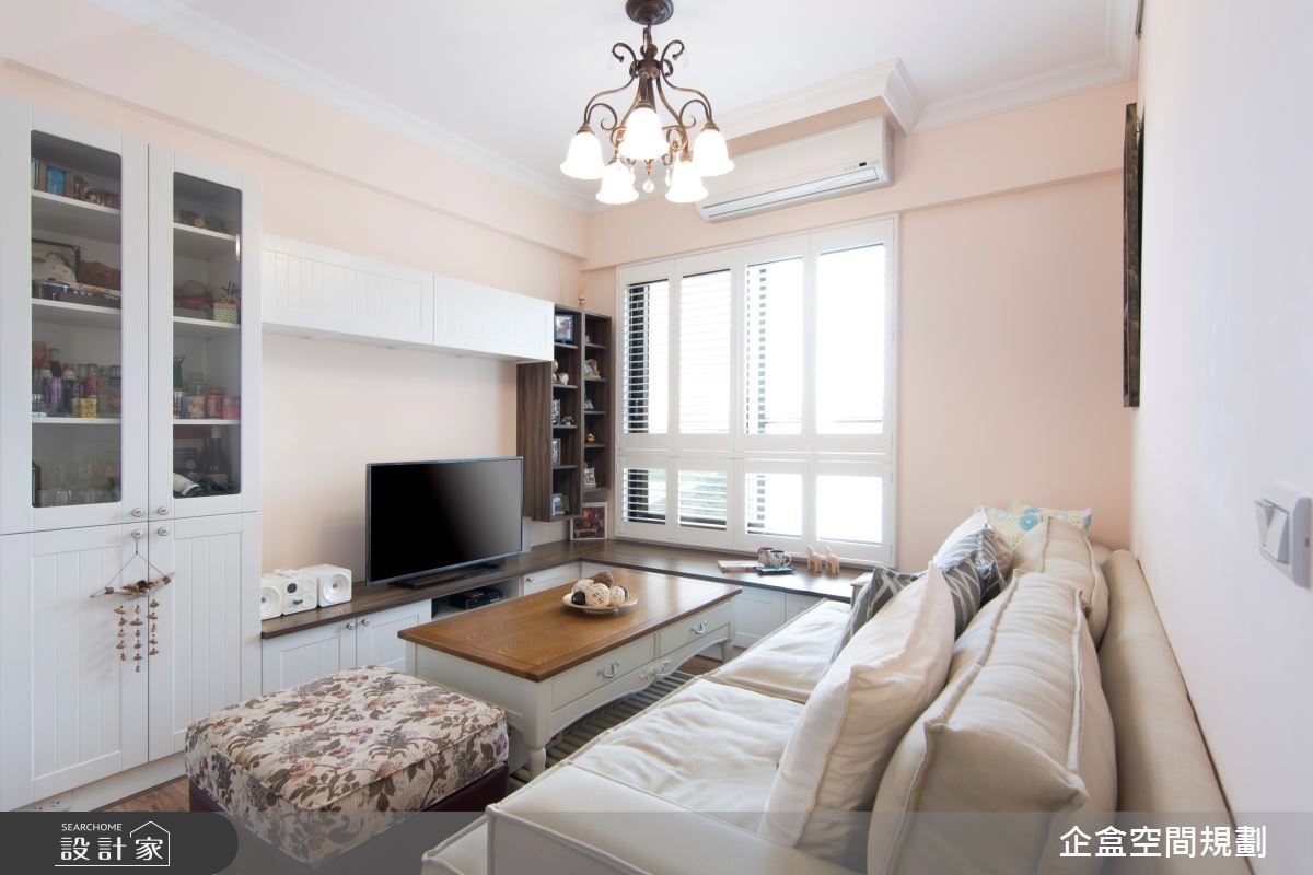 客廳藉著純白百葉窗迎來清透日光,燕麥色的電視牆勾勒簡練的美式線板,與放鬆的木地板相輔相成;此處的大樑痕跡,藉著美式線板的層層推進,變身為再自然不過的設計巧思。為了避免開門見灶的疑慮,餐廚區特地配置一道電動的玻璃格子拉門,既產生遮擋效果,又維持光感與通透視覺。