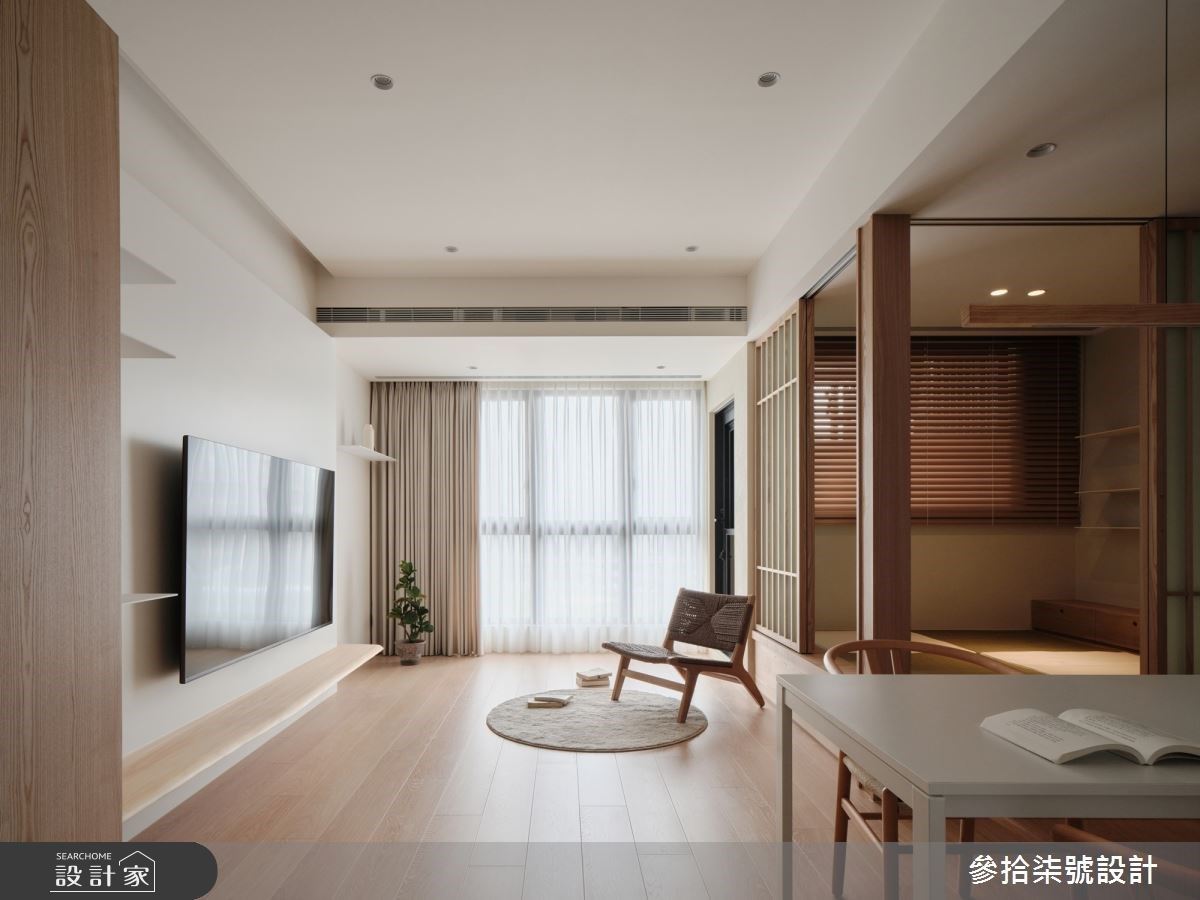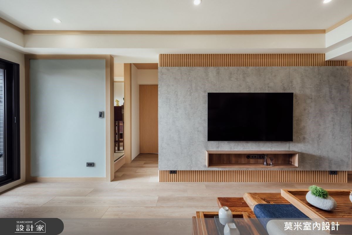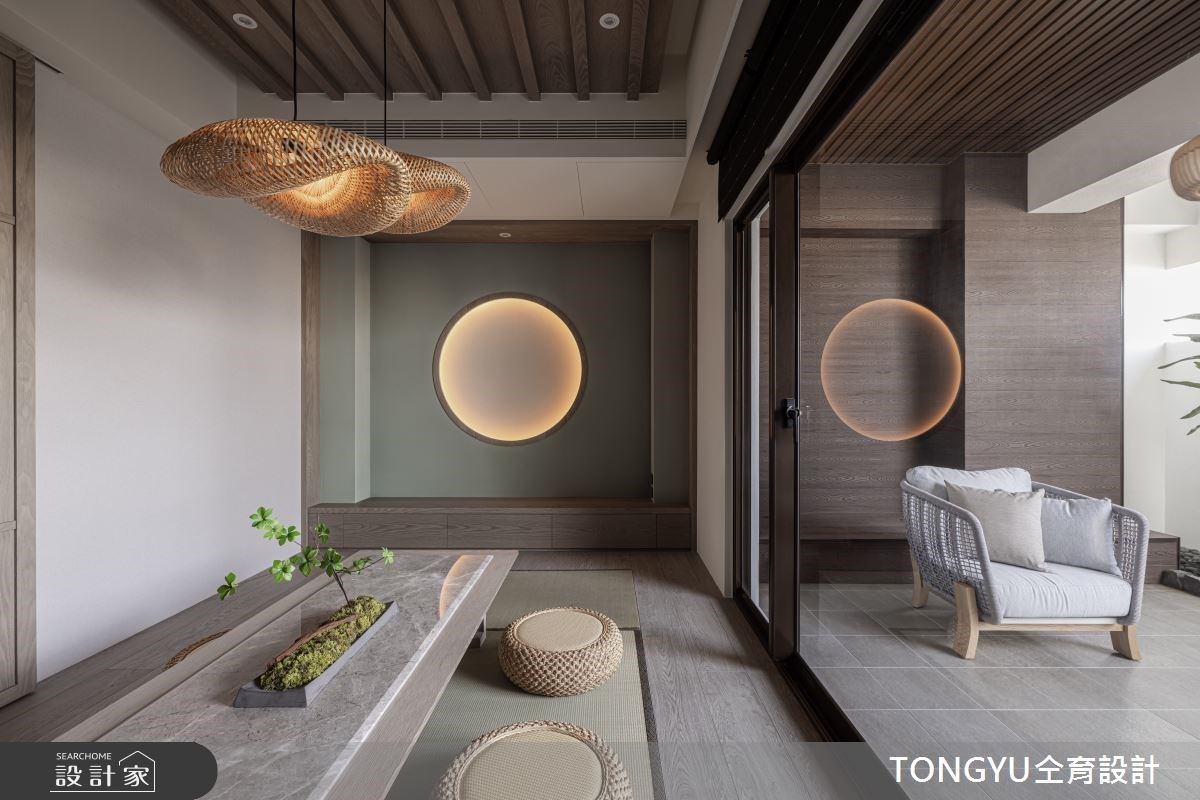 為了傳遞濃濃的日式韻味,設計師將木格柵元素反映在天花板、櫃面上,利用不同的木色、不同的密度,創造出溫潤感,傳遞舒適自在的居家氛圍。