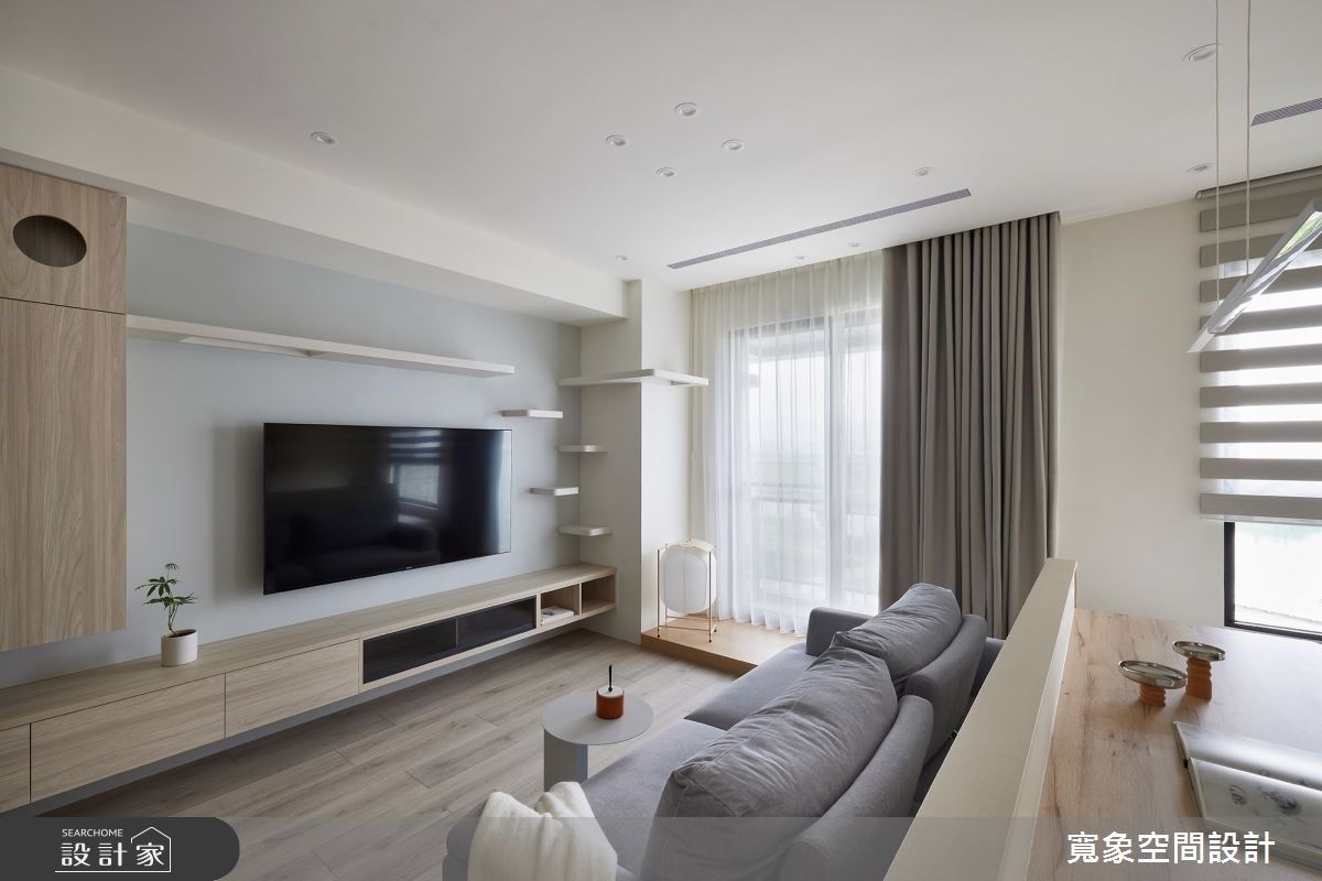 客廳特別訂製鐵件的旋轉電視架,架高小平台作為電視底櫃作用,保持生活中視野的開闊,弱化電視牆面的傳統意識,讓家人間可以不受拘束在整個公領域活動。