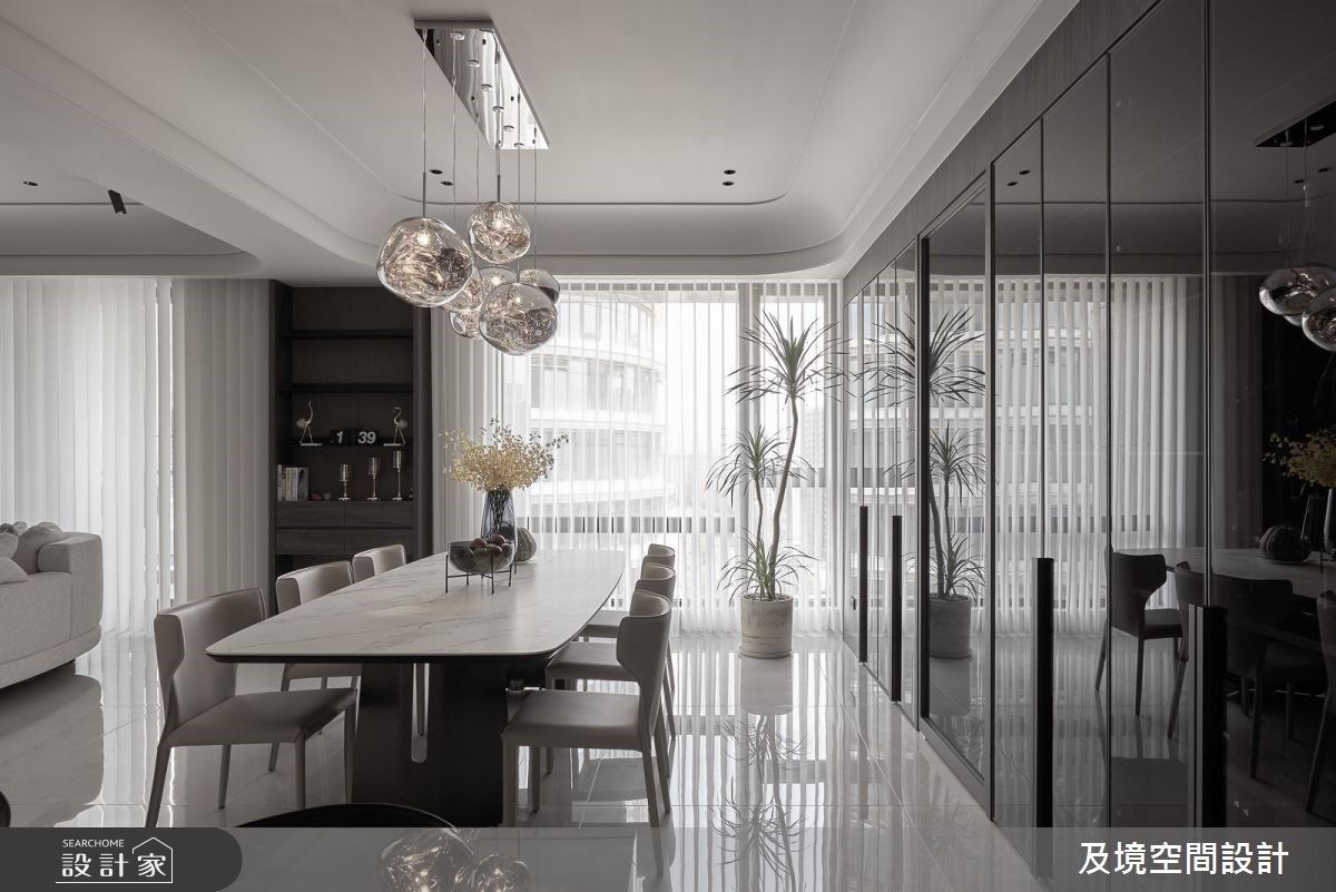 玄關進透過富有藝術氣息的淺色義大利地磚引導入內,圓弧造型的天花板延展屋高刻畫豪宅氣度,在精心設計的燈光映照下,呈現出令人驚嘆的視覺效果。玄關視覺直通客廳大片窗景帶來的通透視野,進一步增強了空間的開闊感。大理石中島連接餐桌,搭配別具設計感的手吹玻璃餐燈;備餐櫃牆板大理石呼應中島,內嵌玻璃展示櫃與燈帶,另一側牆面也嵌入電視並設計隱藏門,建構出精緻的用餐會客空間。客廳沈穩的大理石電視牆,在天花板特殊幾何包樑設計,在線燈的包覆下讓客廳宛如私人藝廊般精緻。沙發後方的多功能房使用玻璃帷幕,使視線無阻隔地延伸形成舒適開放感;書房內的收納設計著重展示性,搭配鍍鈦金屬門框勾勒空間,創造出和諧統一的美感,完美詮釋了現代豪宅的設計精髓。