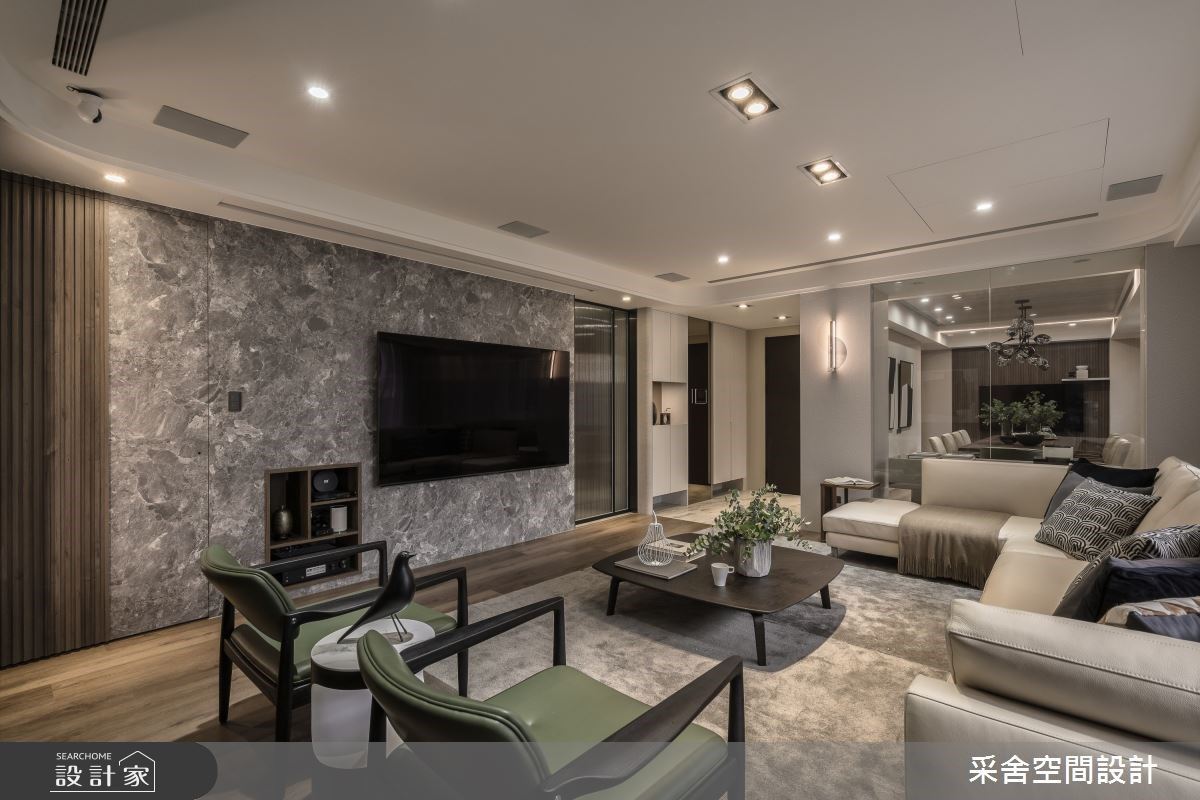 沿著天花線燈進入起居空間,格局經過重塑的公領域視野開闊,而黑白灰為主調的設計交織沉靜氛圍,一入室就能全然放鬆身心。客廳半高電視牆在暗示分野的同時保留開闊感受,細膩的石紋挹注優雅語彙,搭配上下方暖光線燈,簡約之中又富有溫馨暖意。後方開放式書房,由架高地坪界定,書桌設計面朝電視牆將視線聚焦,提高使用者專注力,而後方櫃體則選用矮櫃與層架的搭配,展示藏品的同時,也能保有充足的收納機能。餐廚空間改為開放式,並新增中島吧檯,不僅創造更多元的使用情境,還擴增備料區與電器櫃等機能,日常使用更從容有儀式感。