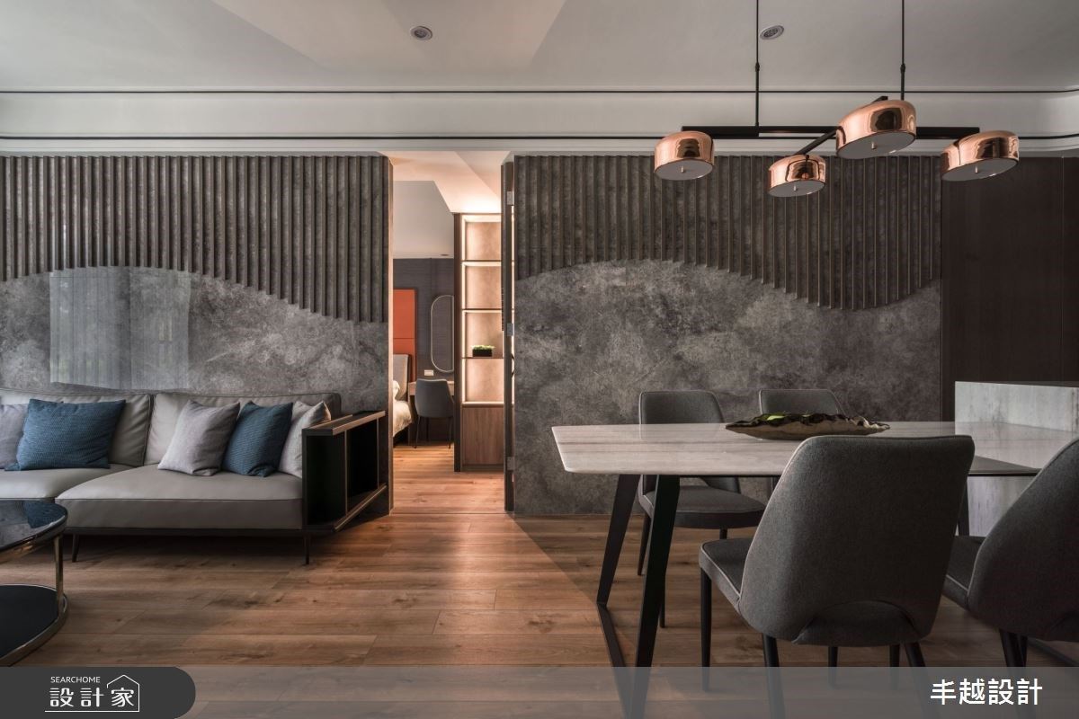 為了滿足長輩退休後的生活娛樂需求,主空間規劃了一個寬敞的公領域,連接客廳和餐廳,不僅提供宴客聚會的場地,也滿足爺爺奶奶在家唱卡啦OK的需求。在客廳的配置上,特別設計了橫向沙發和新增的電視牆,擴大了整個公領域的使用空間,同時電視牆後方也形成了通往廚房的走道動線。依據爺爺奶奶喜好的舒適氛圍,空間以奶茶色作為主題色,同時加入了鍍鈦金色元素,迎合屋主對精緻奢華的喜好。此外,還搭配了奶茶色的軟裝和石材,襯托出溫暖舒適、充滿喜氣的空間氛圍。餐廳區則配備了一張圓滿的大圓桌,滿足三代人一起用餐的需求,並且考量到廚房位置較遠,特別設置了一處茶水區,方便大家泡茶聊天。