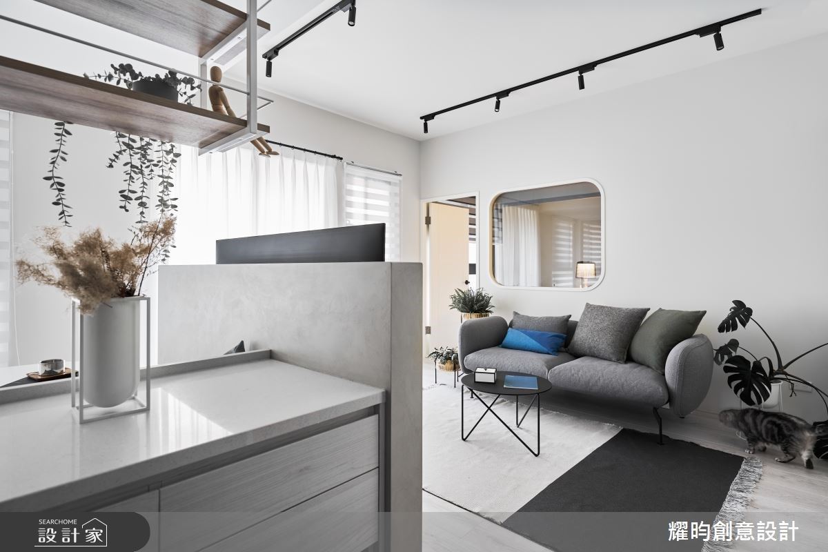 毛胚屋原始建商規劃的是封閉式廚房,耀昀設計根據屋主需求和基於放大公領域的概念下,儘管沒有更動廚房位置,但透過移除門扇、擴大廚房走道開口使空間更加開闊。移除廚房門片後,面對原始結構柱產生的畸零空間,設計師利用轉角訂製弧形餐櫃打造出輕食吧台,不僅提升了公領域的收納機能,針對後疫情訂購外送比例增加的飲食習慣下,也能作為外送暫放區,提升了整體空間的實用性與便利性。除了考量到機能外,在柱體立面貼上特殊的美耐板,凹凸面的質感和燈帶的投射營造出藝術感,不僅提升了整體視覺效果,還在中島用餐或小酌時,讓視線得以透過吸睛的餐櫃連結到廚房,實現了屋主希望擁有開放式廚房的願望。