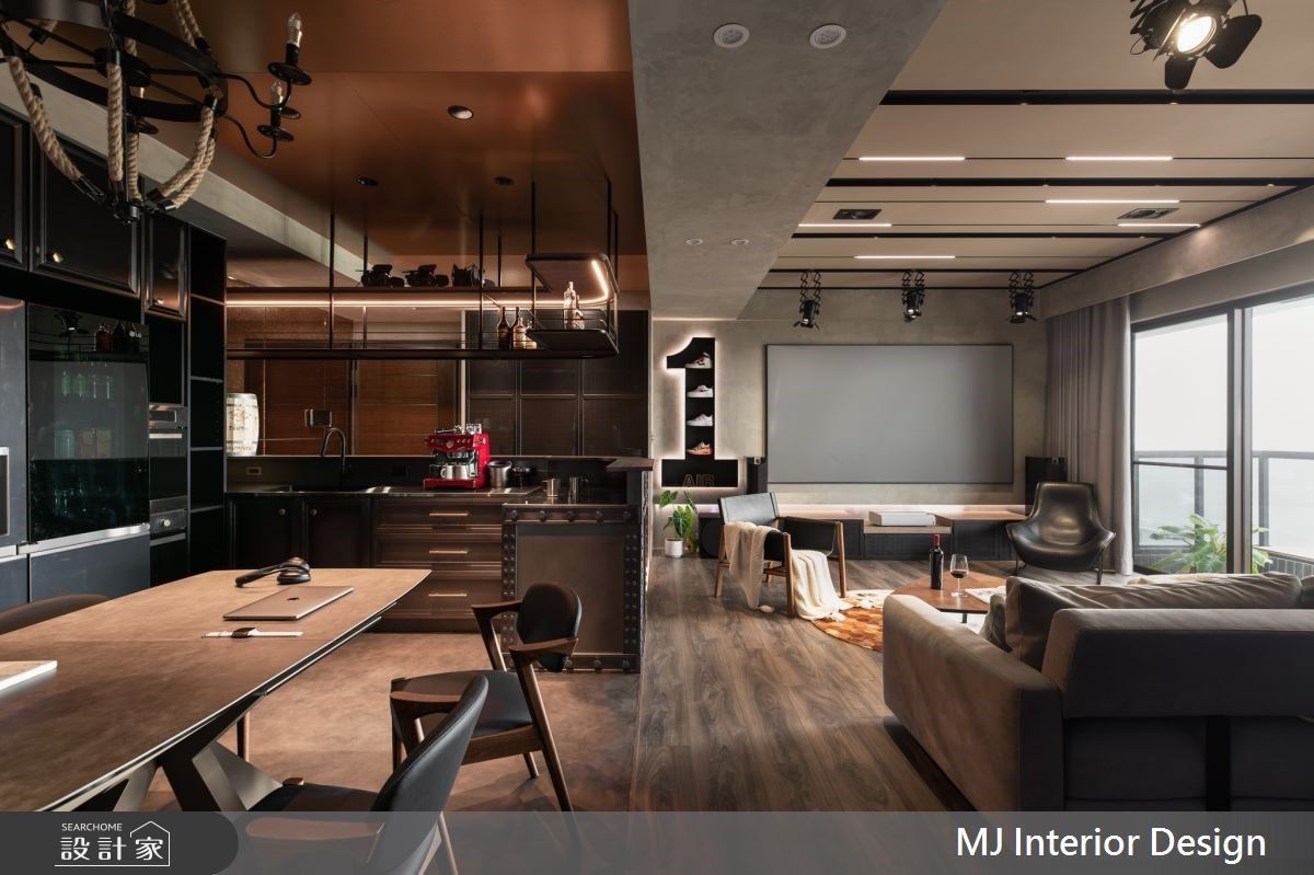 天花板結合燈帶線條,醞釀生活氛圍且美化大樑。廊道規劃整排收納與隱藏門,導引至後方餐廚空間。長型餐桌與中島吧檯呈垂直軸線,形成餐廳與廚房動線;白色石紋餐桌搭配灰階絨布餐椅,搭佐金屬半圓吊燈,傾注些許輕奢美學。餐廳兩側壁面整合收納機能,及通往私領域的隱藏門,內側則布局一字形廚房,透過霧面米色調面板的安排,創造出簡潔、溫馨的空間美感。