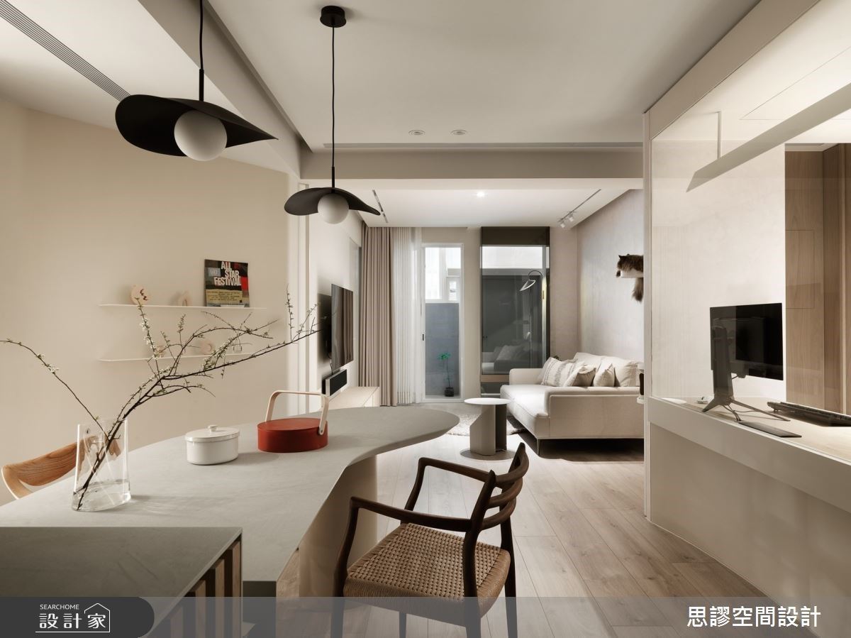 另一方面,特意不做滿的電視牆容許了日光的共享,更以大理石的濃烈自然紋理,跳接櫃體的柔潤弧形和高低起伏的幾何層次,不僅巧妙化解沉重的樑柱結構,隨著光源的映照改變,更富有時尚現代的藝術趣味。餐廳區以天花樑柱位置為定位,形塑出獨立的場域範疇,藉由別緻簡約的吊燈,及暖黃色的間接照明設計,讓家人的日常用餐時光得以溫馨聚焦。