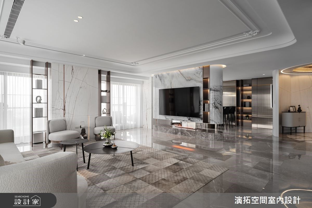 走入玄關,首先鋪陳H字型的鏡面牆,帶來反射放大的視覺效果,再藉由移動式的屏風設計,從鍍金線條裡,捕捉泡泡般的圓弧玻璃,不但帶入繽紛亮眼的色彩,又維持簡約優雅的質感。過渡至廳區,特意打造一面內嵌的弧形展示牆,悄悄暗示行進的動線,更刷上與電視牆同款的銀白特殊漆,搭配設計師親手繪製的藝術品,呈現出一體成型的優雅面貌。