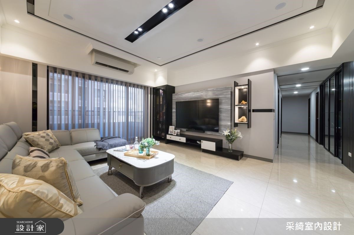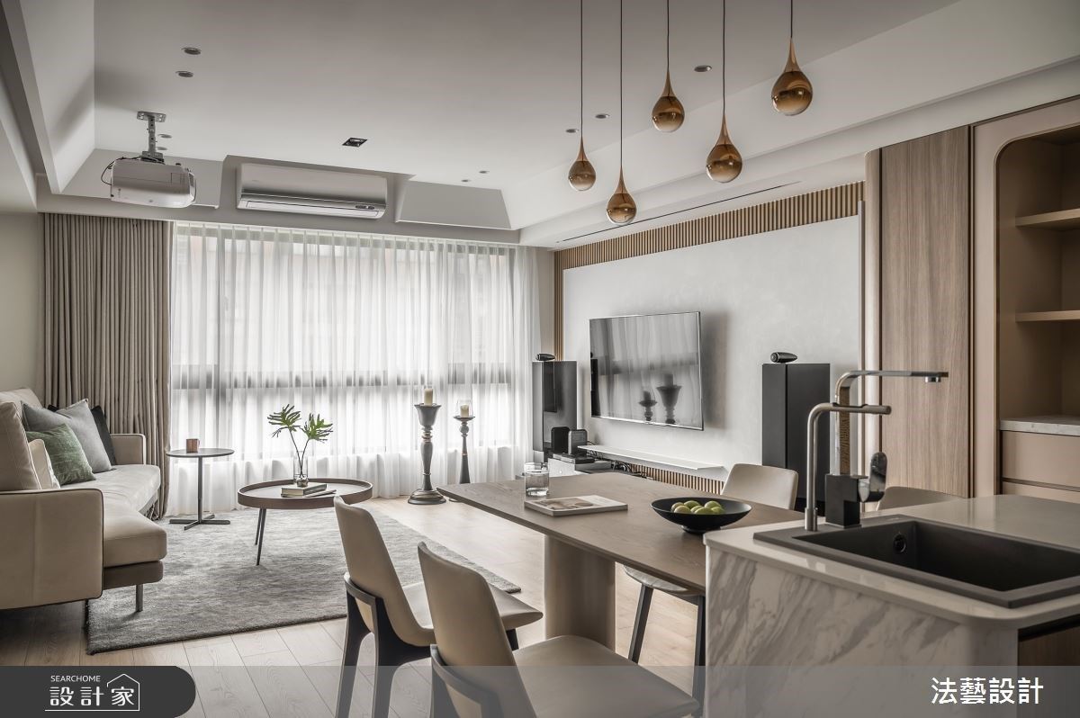 入門玄關處鋪陳米色調造型花磚,無形間明確了落塵區分野,立面則依序排佈了端景櫃、鞋櫃及一日衣架等機能,打造流暢的外出及回家動線;步入公領域,以開放式格局延攬充沛日光與開闊視覺饗宴,客廳電視牆以錯落有致的展示格櫃,搭佐白色、木質相間的層次變化,巧妙地兼顧了設計美學及收納機能,廚房沿用原建商配置的廚具,增設中島取代既定的餐桌型態,讓用餐時刻增添了一絲愜意、自在,同時善用每寸坪效,中島旁留白的牆面則嵌入了展示壁龕,形塑簡約時尚的居家端景;其次,書房空間捨棄既定隔間型態,改以通透玻璃圍塑靜謐的閱讀場域,讓居者能依照使用情境,彈性調節書房型態,而書房臨窗處更規劃休憩臥榻,成為午後閱讀時放鬆的療癒角落!