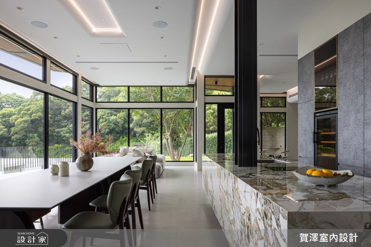 邁入居室,一樓空間規劃為開闊的公共空間,臨窗處配置休憩客廳,此處刻意保留了原先的嗚高優勢,全家人的共處時刻沐浴於和煦日光下;其次,餐廚區以一道彈性玻璃拉門界定烹飪及用餐兩場域,更杜絕了做菜時產生的油煙,而半高備餐櫃不只擴增了收納機能,更延伸出水槽檯面,兩盞俐落沈穩的黑色吊燈更描摹了清晰的空間表情,備餐櫃檯面更成為擺放咖啡機等小型家電的角落,提供一家四口餐廚區便利的使用方式;拾梯而上,二樓空間規劃為孩子們的臥房,轉角走道處擺放一張小型沙發,無形間拉近了一二樓場域的距離,更創造出家人的互動視線。