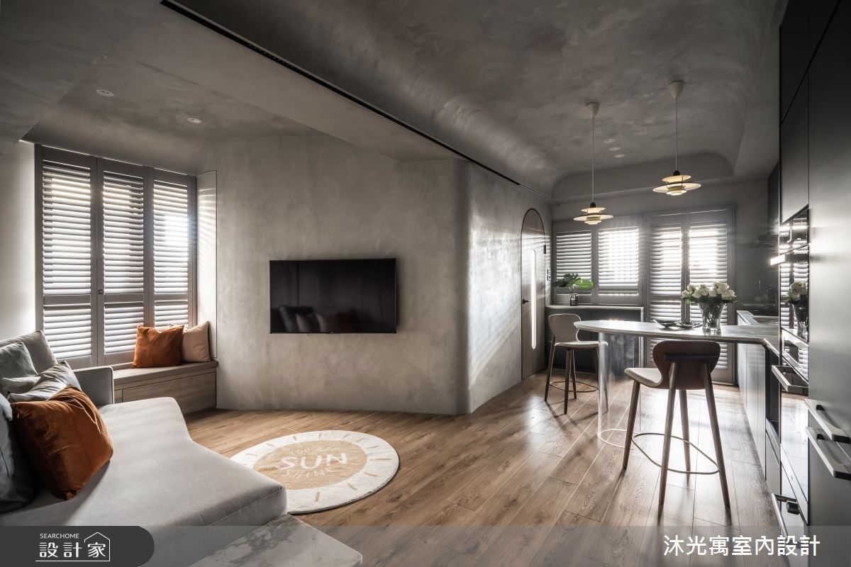 客、餐廳雖沒有實體隔間,卻透過人字拼木地板、磨石子地坪的質材轉換,悄悄寫下隱形的場域界線。天花設計有別制式做法,以緩緩上升的圓弧曲面,巧妙修飾原有的結構痕跡,又留下柔和放鬆的氣息。開放式的餐廚場域,延續同樣的淺米色石材,打造偌大的中島吧台,並加入流理台、IH爐功能,取代傳統的廚具配置,大幅提升小宅坪數的使用效率。