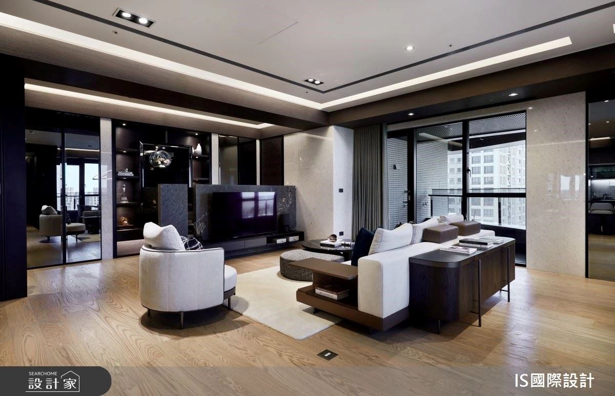 入口處透過左側的收納櫃,劃分出廚房與玄關的格局界線,而右側牆面則整合穿鞋椅、鞋櫃、展示櫃及電視櫃等多元功能,不僅滿足各種儲物需求,還能夠延伸牆面造型,創造宛如寬敞大宅的視覺效果。公領域的天花板利用間接照明,搭配電視牆、沙發後方展示牆、玻璃餐櫃的燈條襯托,讓各處量體變得相當輕巧,又大方呈現了屋主的收藏品味,家就是情感與回憶的最佳容器。