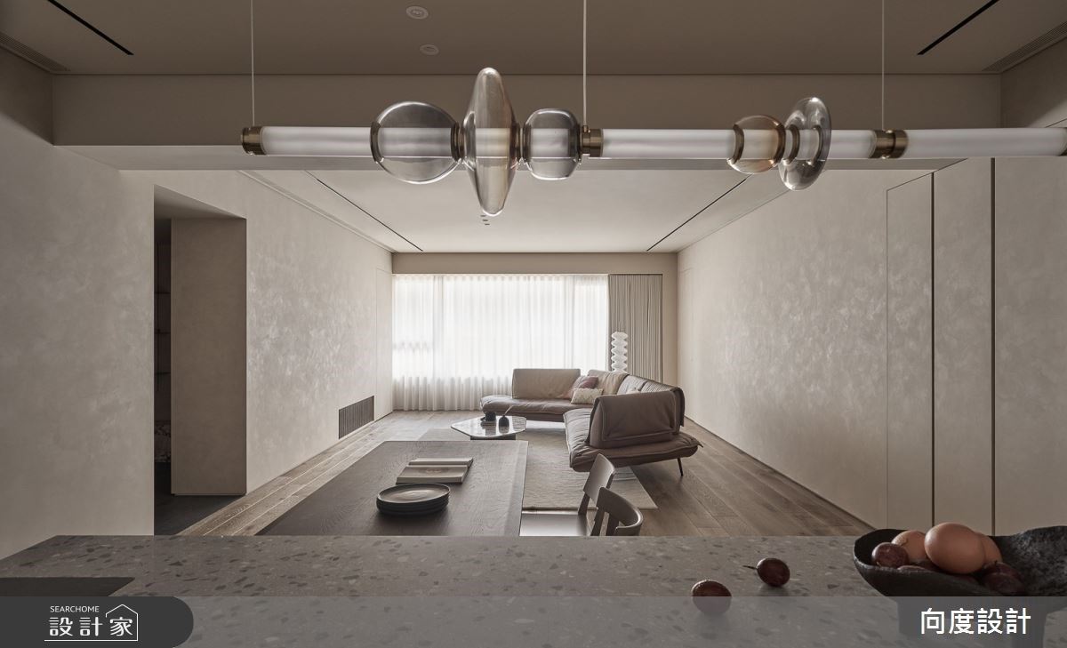 一進門,玄關善用挑高優勢,搭配圓形光膜燈飾,營造如天井般的自然光氛圍,讓人感到瞬間放鬆。玄關左側隱藏的穿衣鏡與正對大門的儲藏室,既實用又不影響視覺的簡潔俐落感,讓屋主可以好好收納衣物、鞋子和行李箱,並整理儀容。走進公領域,設計師運用大量的幾何元素,包含直線、方形及圓形的細膩結合,提升空間的層次感與趣味性,實現宛如美術館的居家美學。