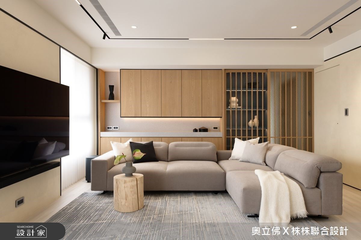 長期旅居海外的屋主,希望在返台渡假時,能有一個與親友聚會的溫馨場域,因此購入了這間室內27.8坪的新成屋。在事前討論中,屋主提出希望這個空間能擁有像咖啡廳般的療癒氛圍,同時又希望整體規劃能跳脫制式布局。春雨設計團隊先將不必要的隔間拆除,納入公領域範疇,再將行李箱、備品收納等需求巧妙融入,在美感與機能之間,取得絕佳的黃金比例。