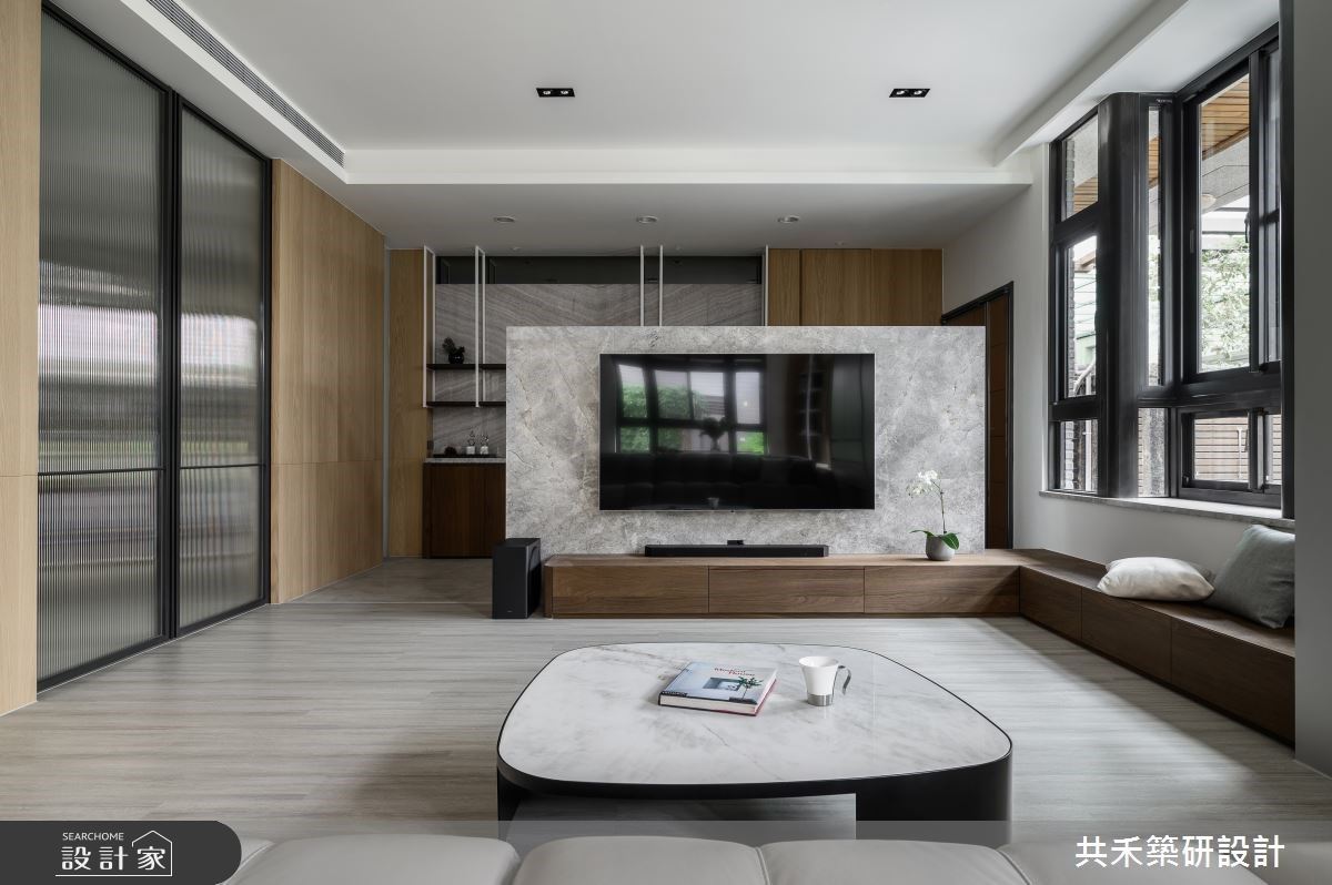 針對原始窗戶台度做改善,改造成落地氣密拉門,這不僅提升了室內的採光,還極大地改善了空間感。客廳的座向經過深思熟慮後,採用木作與鐵工打造的旋轉電視半牆,不僅滿足視聽需求、還在牆面端景上加入了對稱設計與掛畫,營造出平衡美感。電視牆上方以木皮門框界定不同場域,沙發背牆則是一大片落地窗,地板選用120x120的大型地磚展現大氣尺度。