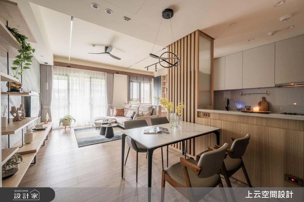 玄關為開放式設計,異材質地坪暗示落塵分野,通透開放的感受,讓剛返家的人,能立刻投入溫馨的互動中。收納規劃則以開放式層架搭配懸浮櫃呈現,輕盈的量感與頂光投下的重點照明,讓層架瞬間化為優美的入室端景。居家空間內部,以楓葉橘色電視牆為中心,形成一條流暢的回字型動線,半開放的空間感,將大面採光引入室內,既能達到療癒身心得效果,還能在無形中串連起居者間的互動。客廳沙發背牆選用灰調特殊漆拭底,再與日式方格設計拼接,禪意漸濃。餐廳設計與之呼應,並在禪意之上點綴一盞古銅吊燈,古樸之中又不失奢雅氣息。