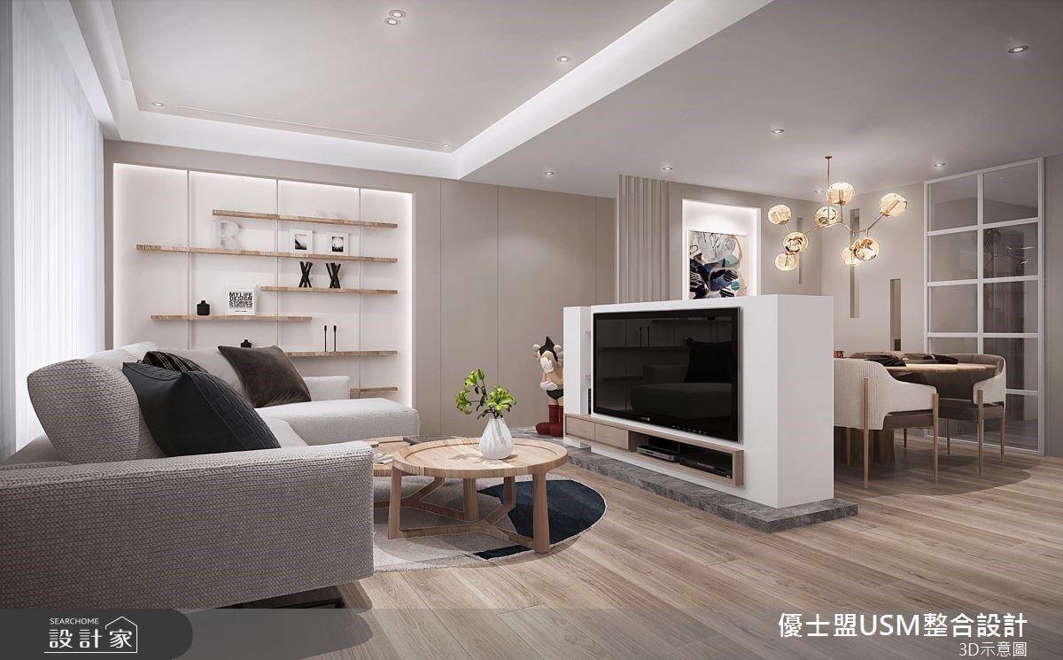 因為上方有結構樑的關係,餐廳區域的立面設計呼應臥榻區的框的造型,設計師在這裡使用木質與奶油色兩種色彩,設計了展示櫃與收納櫃,另外還藉由結構樑的深度,預留了一個可以收納餐桌的位置,讓屋主可隨著使用需求決定要將餐桌收起或拉出,這樣可確保通道的寬度。