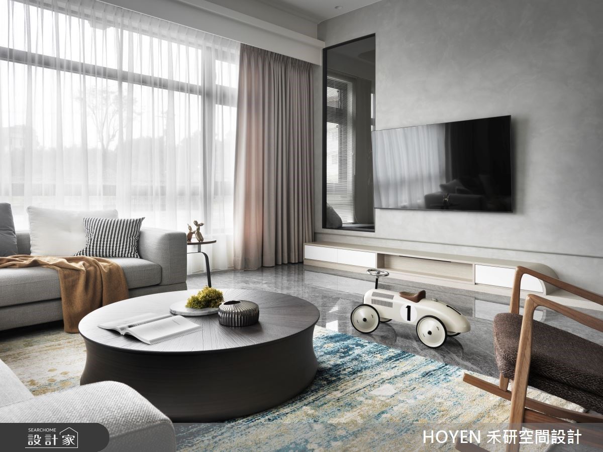 玄關長廊以黑、白、灰為現代風主軸破題,一旁的黑玻櫃體,運用材質特性,模糊空間界線,延伸廊道縱寬,消弭深色狹長空間的壓迫感;另一側則將臨時收納、穿鞋椅整合,透過黑色調和,線燈點綴,視覺平整輕盈、有整體感,機能與空間坪效完美相融。繼續往內走,客廳地坪略微架高,細膩的魚骨木紋地板,挹注優雅的法式風情。灰調電視牆以弧形銜接客廳與玄關櫃體間的過渡,當窗外日光灑落,牆體表面紋理閃爍,簡約卻富含層次。