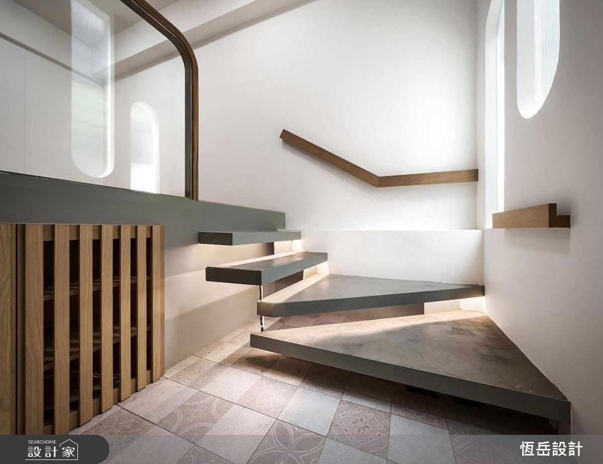室內改造風格結合日本和北歐元素,營造出和諧的日式與北歐元素的Japandi日式侘寂風;大量使用玻璃材料和鏡面,以維持空間的開放感,確保自然光的流動,並運用格狀安全窗戶則在光線之間達到平衡。由於屋主經常外出,不放心長輩獨自在家生活,因此全室規劃利用可遠程監控的智慧家庭系統,讓屋主可以輕鬆遠程控制空調、除濕和照明,確保房屋時刻保持在最適宜居住的狀態。玄關空間特別採用懸浮式樓梯來解決高度差問題,設計上以流暢線條和溫暖材質為特色;黑色玻璃增強了空間的深度感和開放感。除了視覺得美觀與空間的開放性,開放式鞋櫃設有條狀隔板,方便根據使用頻率取放物品;懸浮樓梯和隱藏式扶手保障母親來訪時的安全,走廊處使用倒圓角設計以降低碰撞造成受傷的風險,考量到安全與美觀的整合性設計,讓無障礙空間顯得溫馨又別具風格。