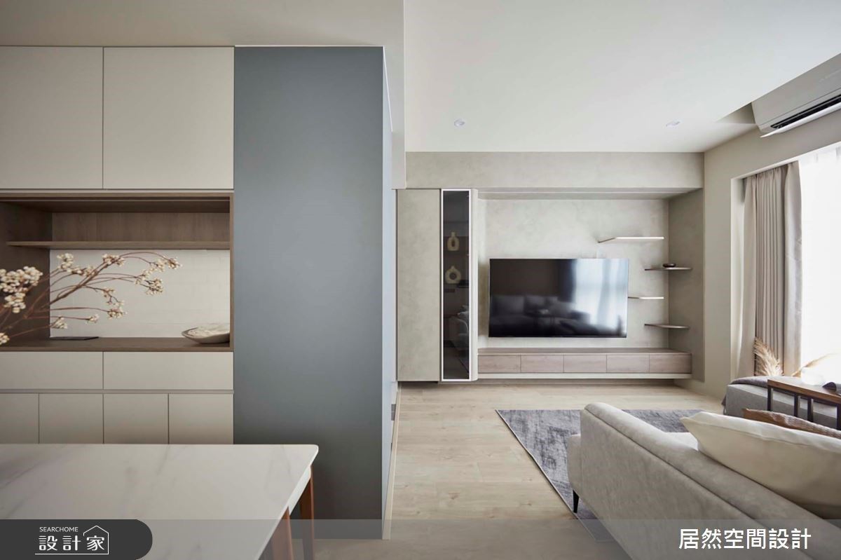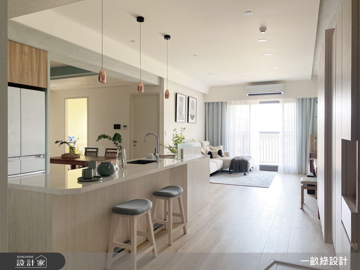 整個空間以輕柔的木質元素為主調,並搭配森林綠色牆面來界定不同區域的功能。電視牆後方則採用押花玻璃帷幕設計,讓後方客房的自然採光能夠照射到玄關,提升整體光線。玄關的鞋櫃設計採用雙面形式,與客房共享櫃體,有效活化了有限的坪效。客廳區域則以淺木色為主調,讓櫃體顯得輕盈,電視機櫃下方的鏤空設計,也為掃地機器人提供了停泊空間。客廳與餐廳採取一字型佈局,餐桌巧妙地設置在結構柱的位置,廚房則保持封閉式設計,避免油煙飄散,但門扇改為玻璃材質,能夠引入自然光線。