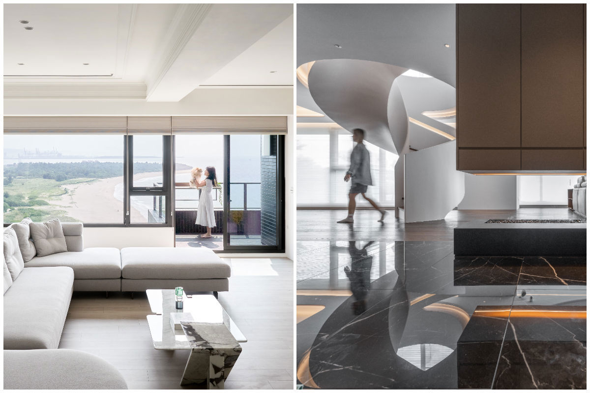 原案橫樑和直柱壓迫空間,設計師將天花板採斜面處理搭配間接照明,削弱橫樑的壓迫感,讓空間更具層次感和視覺開闊性。有效解決結構性問題,同時成功將光影變化引入空間,增添了室內的動態美感。