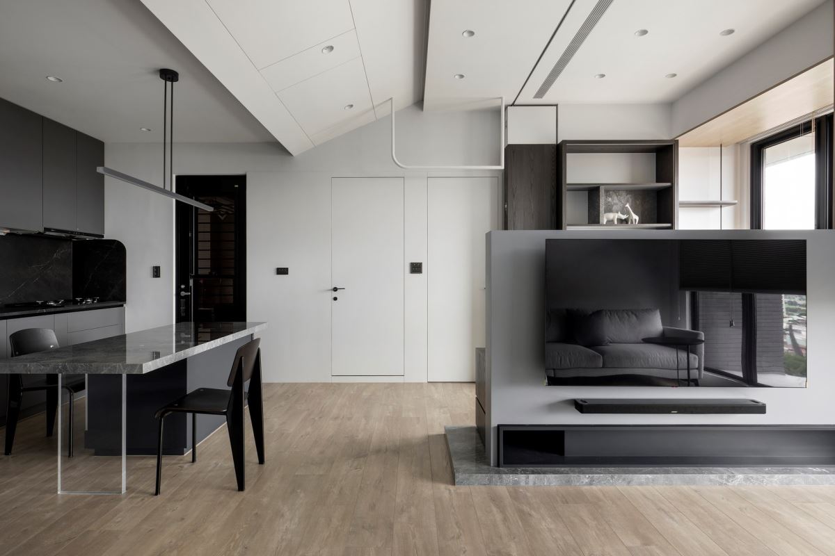 有限的空間內顧及開放性與流通度是一大挑戰,本案採開放式規劃,將客廳、餐廳和廚房無縫結合,創造出寬敞與流動性。利用推拉門和旋轉門,主掌空間彈性,使空間可隨需求調整開放與封閉的程度,尤其是廚房的旋轉窗,將原本的牆面替換為玻璃木框窗,讓光線得以自由進入並保持廚房區域的清爽,避免油煙散播。