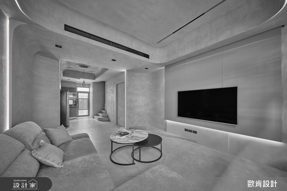 步入一樓公領域,玄關地坪鋪陳天然的石紋肌理,一道量體隔屏打造沈澱心緒的落塵空間;而低彩度的微水泥塗料由天地壁延伸至櫃體材質,透過適度簡化色彩,詮釋侘極風格的細膩溫柔,臨窗處則規劃為一家三口的休憩客廳,設計師刻意沙發安排於靠牆處,並捨棄既定的電視牆型態,使窗外的綠意造景納入室中;接著,餐廚空間以開放式設計延攬通透的視覺感,餐桌上方的金屬絲線進口吊燈,與立面的吸睛石紋薄磚相呼應,不僅巧妙藏匿了電箱的位置,更形塑優雅柔美的第一印象,廚房空間以L型檯面擴充充裕的料理尺度,小型中島納入酒櫃機能,亦成為餐廚場域的銜接媒介,最後,客浴拉門延續微水泥塗料,巧妙兼顧美型外觀及實用機能,讓生活美學遊走於透天別墅內的每一隅。