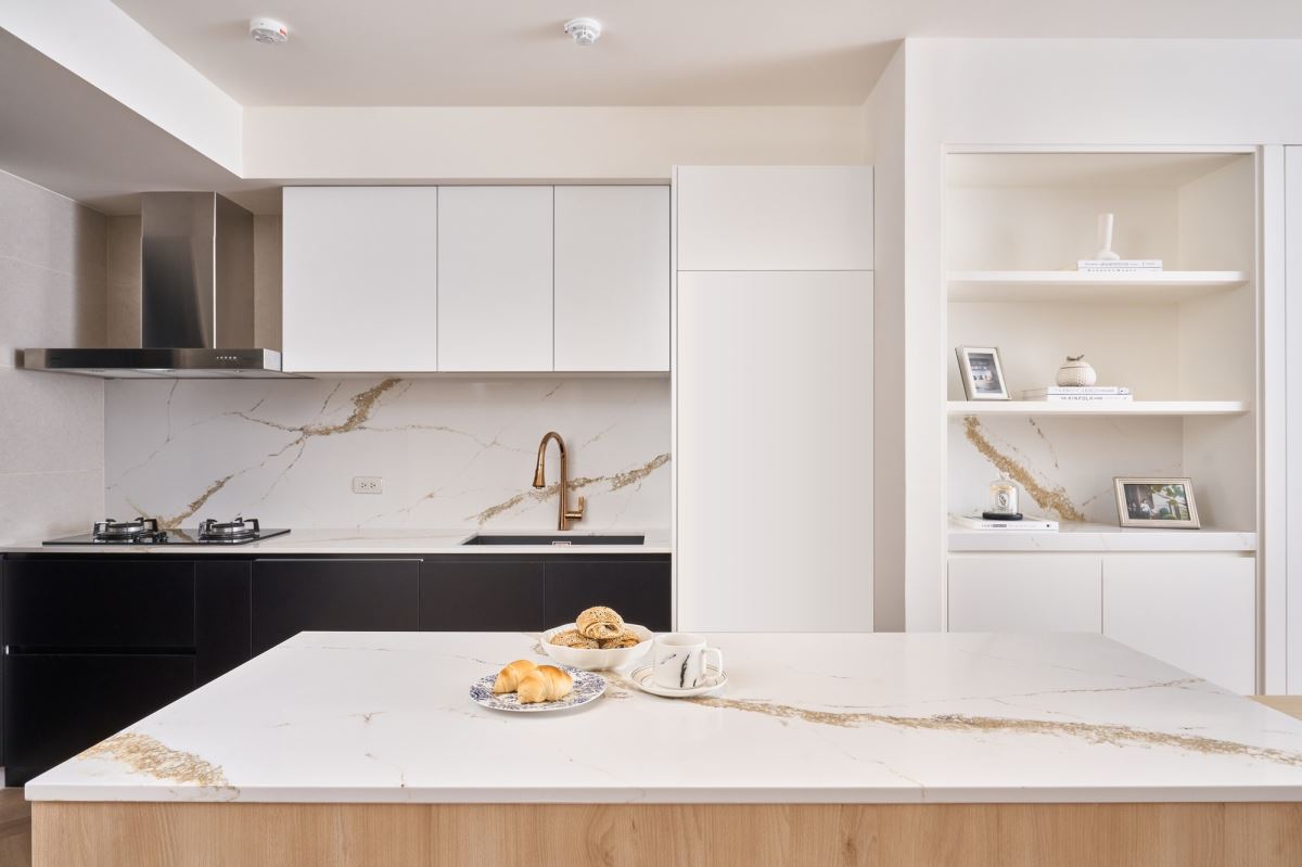 為了實現內外廚的高效運作,張總監在水電配置上花了不少心思,他考量屋主一家的使用動線,大幅調整廚房的管線位置,確保內外廚的給排水順暢。除此之外,由於室內主牆以淺色為主,所以挑選了深色的櫥櫃款式,搭配黑色鏡面的 svago 進口廚電,讓視覺更有層次,並將機能及收納自然融入俐落造型中。
