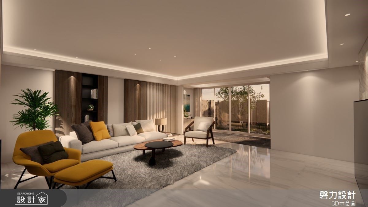 客廳以L型沙發圍塑出放鬆的休憩區,電視主牆藏有大量收納機能,搭配淺木地板與大片落地窗,使空間顯得敞亮而溫馨,搭配上米灰色特殊塗料搭配圓弧天花板,加上光條點綴,讓視覺層次更顯柔和。書房則運用玻璃與木質組構的隔屏,延伸視覺深度,同時保有隱私與多功能用途。