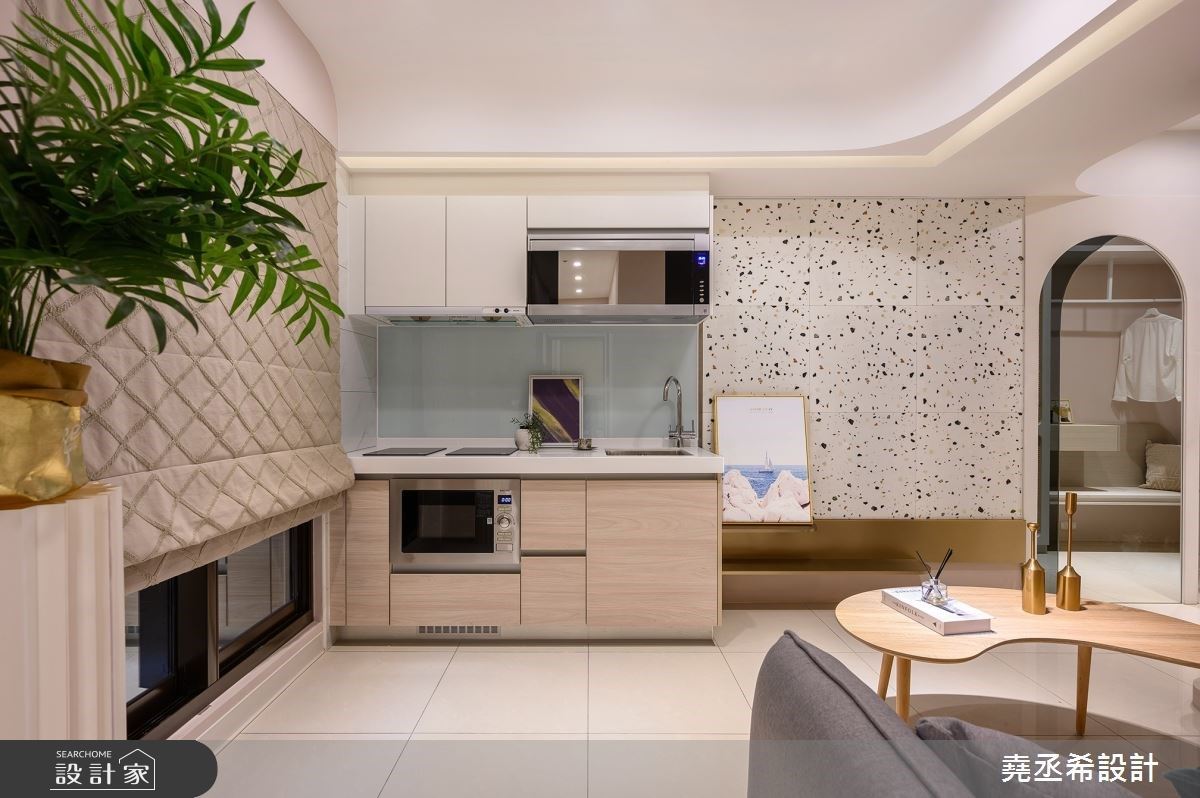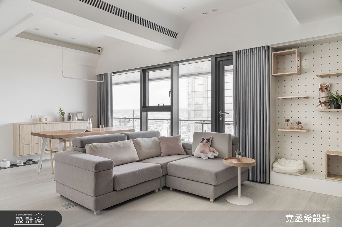 玄關落塵區以異材質地坪搭配玻璃屏風界定,淺色系的色彩搭配,讓狹長的玄關在被兩側高櫃包圍的狀況下,依舊寬敞明亮,還避免了隱私疑慮。大門側邊設有一座穿鞋椅,後方牆面以多個攀爬姿態的人偶為吊掛架,機能完善且趣味性十足。客廳色調溫煦,灰色特殊漆所鋪陳的電視牆立面,藉由格柵語彙修飾一旁的門片,輔以另一側盡頭處的弧形語彙,異材質的拼接堆疊出豐富層次,柔和無壓又輕盈。沙發背牆則預留了掛畫軌道,當精心調配的直接光與間接光灑落,又是一處絕美的視覺端景。