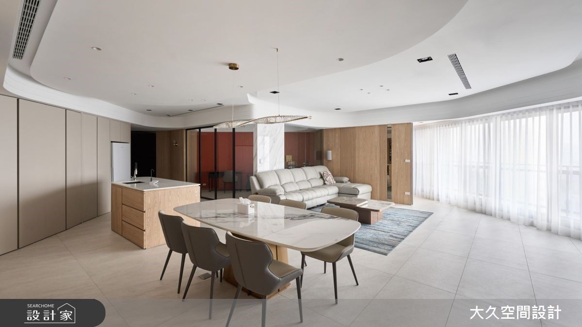 玄關鋪設灰色石材,落塵區能避免髒汙帶入室內,鐵件造型屏風,增加穿透感,也創造氣宇非凡的迎賓系玄關。公領域保留良好採光,日光透著紗簾映照,營造柔和輕盈的自然感受,客廳與鋼琴區串聯,拉深縱軸,視野寬敞開闊,選用輕柔的大地色為基調,在天花、地面及牆面材質變化,豐富視覺感受,卻又不失整體性,造型地面與曲面貫穿,場地可彈性調整,符合各種生活情境使用,塑造無壓的生活場域,客廳廊道一路延伸到餐廳,結合展示與收納,讓屋主掛上收藏的畫作、擺設珍藏品與書籍,將廊道牆面轉化為居家藝廊般高雅氣質,更能襯托悠揚的琴聲。廚房分為內廚熱炒區與外廚輕食區,並以長虹玻璃拉門區隔,避免油煙飄散,外廚區增設吧台,輕食小酌富有情調。屋主可以在書房磁吸牆,張貼全家福照片或小孩獎狀,從客廳視角是完全被隱藏,相當有巧思。