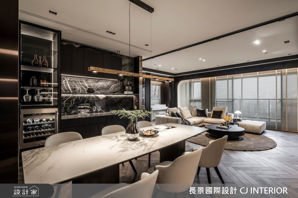 冰箱擺放位置是原廚房區最大的問題,因廚房和玄關隔牆不夠寬,不僅動線狹小,冰箱動線不好使用,且有風水問題,為了不讓走道過狹,設計師在延伸廚房隔間牆的尺寸上特別保留恰好的比例空間來擺放冰箱位置,放大餐廚空間的效果。延伸廚房空間並作為整體空間轉圜凝聚的大圓弧紅銅金吧台,設計概念為:家庭與閨密的共享時光!落差些微的高低檯面,讓女屋主在輕食烹調的同時能與親友放鬆聊天暢飲,搭配一盞低調奢華的水晶玻璃吊燈,增添了一抹奢華氣息和身處夜店Lounge Bar的氛圍。廚房檯面採用奢華元素中點睛之技的黃金流水線大理石紋的石英石,更加襯托出整體空間的低調奢華感。