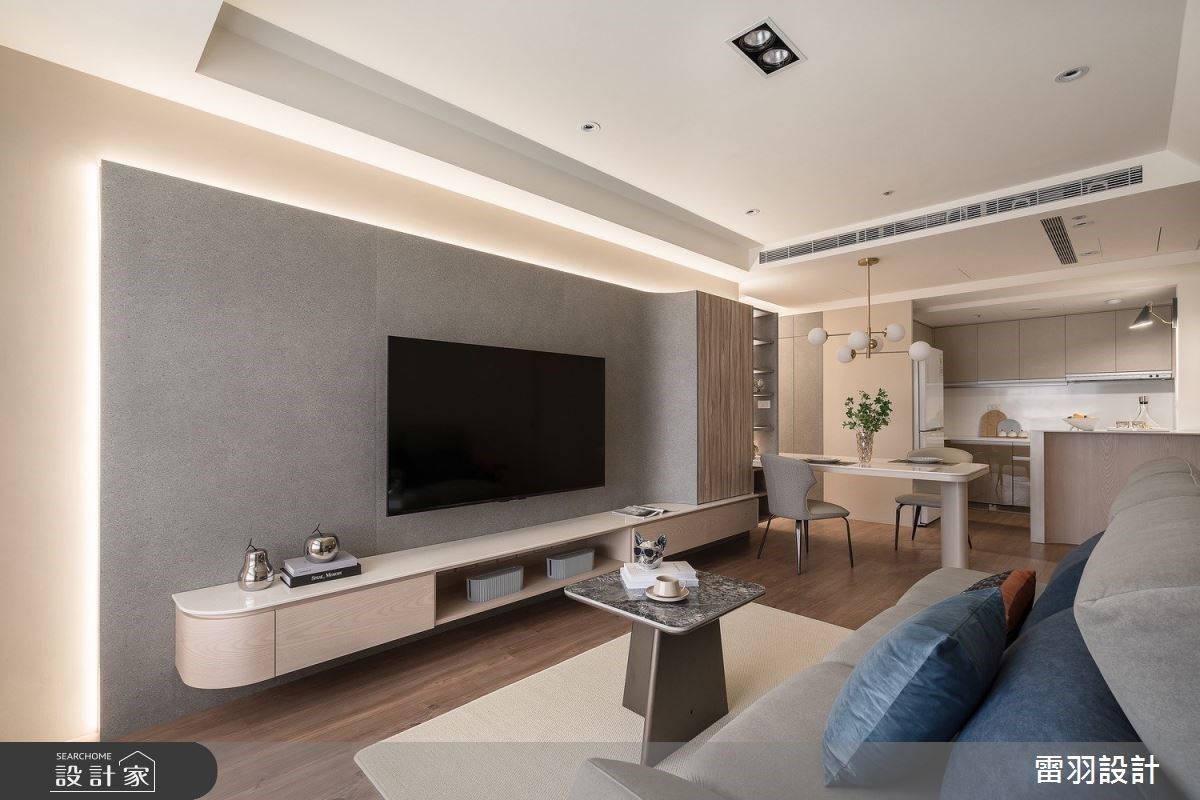 主臥室色彩柔和,床頭牆灰色特殊漆,在內嵌線燈的照射下紋理若隱若現,營造出柔和靜謐的寢臥氛圍。床尾立面衣櫃,一半藉由黑玻門片遮擋,既不會壓縮空間感,也能確保隱私;另一半則做為一日衣櫃與汙衣櫃使用,坪數有限,但機能更完善。
