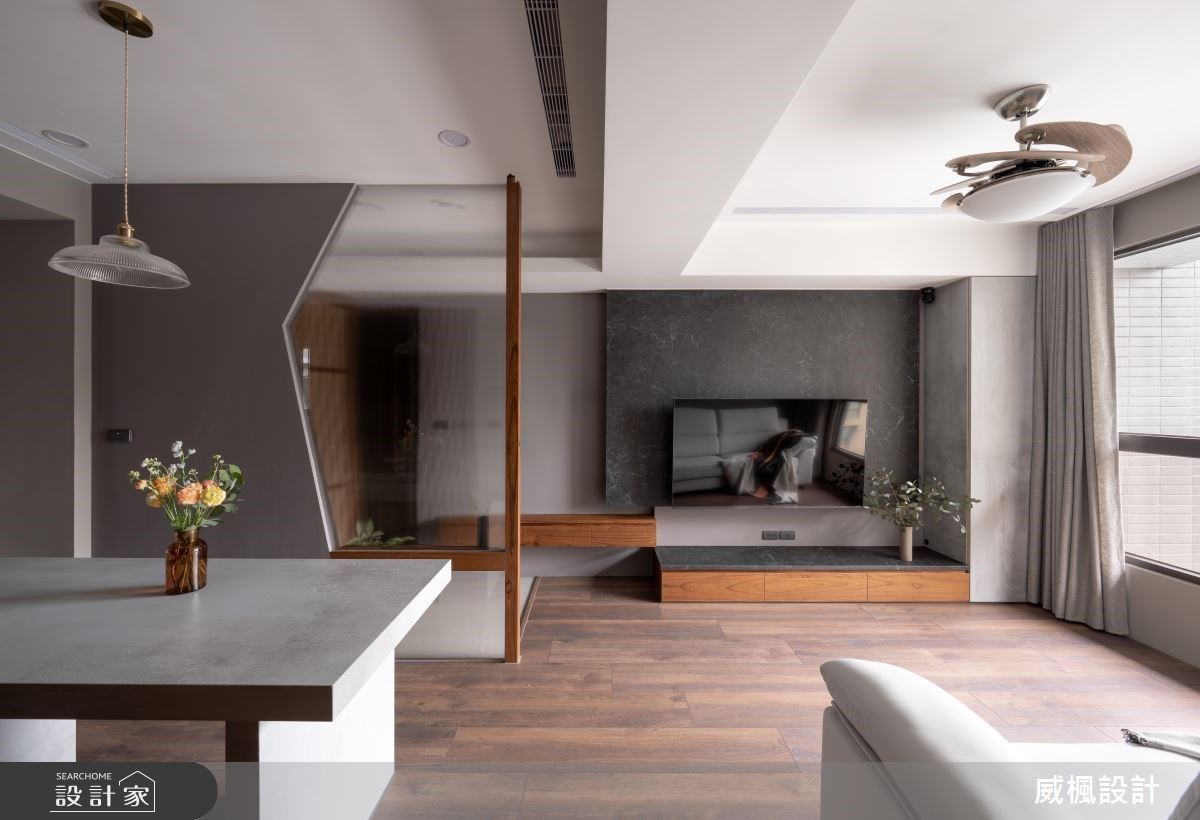 公領域設計採開放式概念呈現,推開大門的瞬間,即可將溫馨的家景盡收眼底。玄關收納規劃於樑下,懸浮頂天設計,在輕盈的視覺中,兼顧平整視覺與輕盈感受。餐廚與玄關間,藉由中島吧台界定,白色石材挹注現代時髦氣息,下方餘裕則增設零食收納空間,滿足日常收納,也維持簡潔清爽的視覺。餐桌部分,考量孩子遊戲需求,選擇採用活動式餐桌,孩子年幼時,能保留自在活動的空地,當孩子長大,就可以再添購餐桌,用餐之餘,還能作為一同辦公閱讀的互動空間。