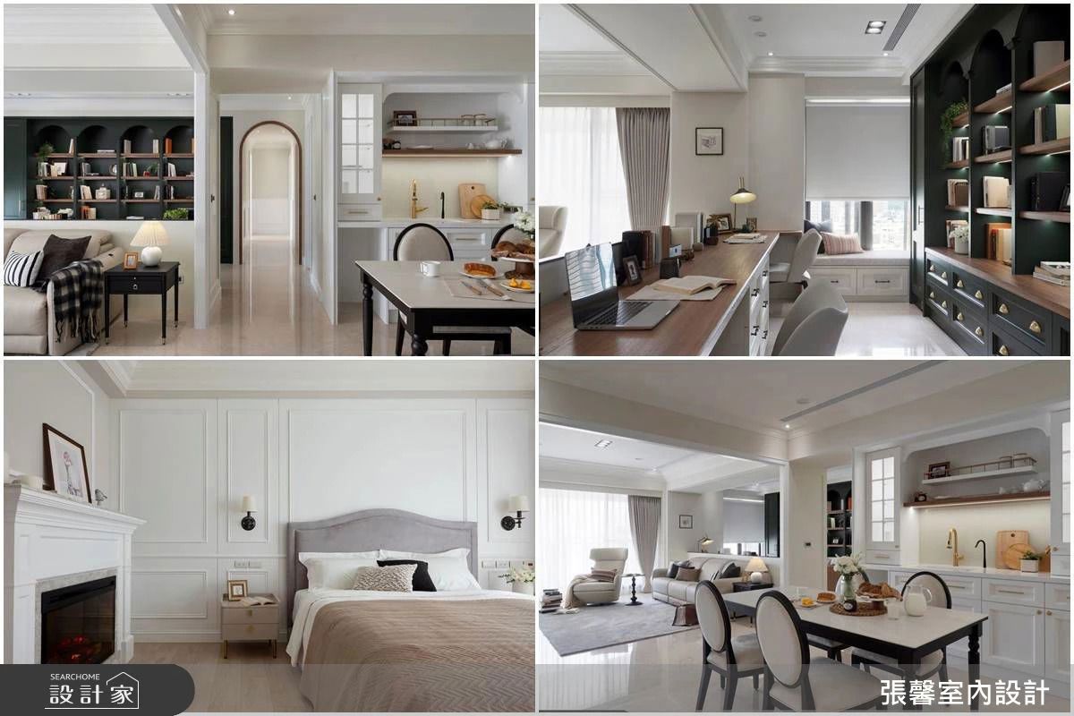客廳運用弧形天花修飾大樑,使整體視覺更加柔和順暢,並搭配間接照明,營造溫馨且寧靜的氛圍。電視牆採用深木紋材質,與對應的水泥質感沙發背牆形成對比,展現出日式風格中最講究的自然與質樸之美。書房設計整合展示、收納與書桌機能,讓空間既具功能性又不顯雜亂。窗邊特別設置木紋臥榻,當閱讀或工作之餘,能夠短暫休憩,為生活增添更多悠閒時光。