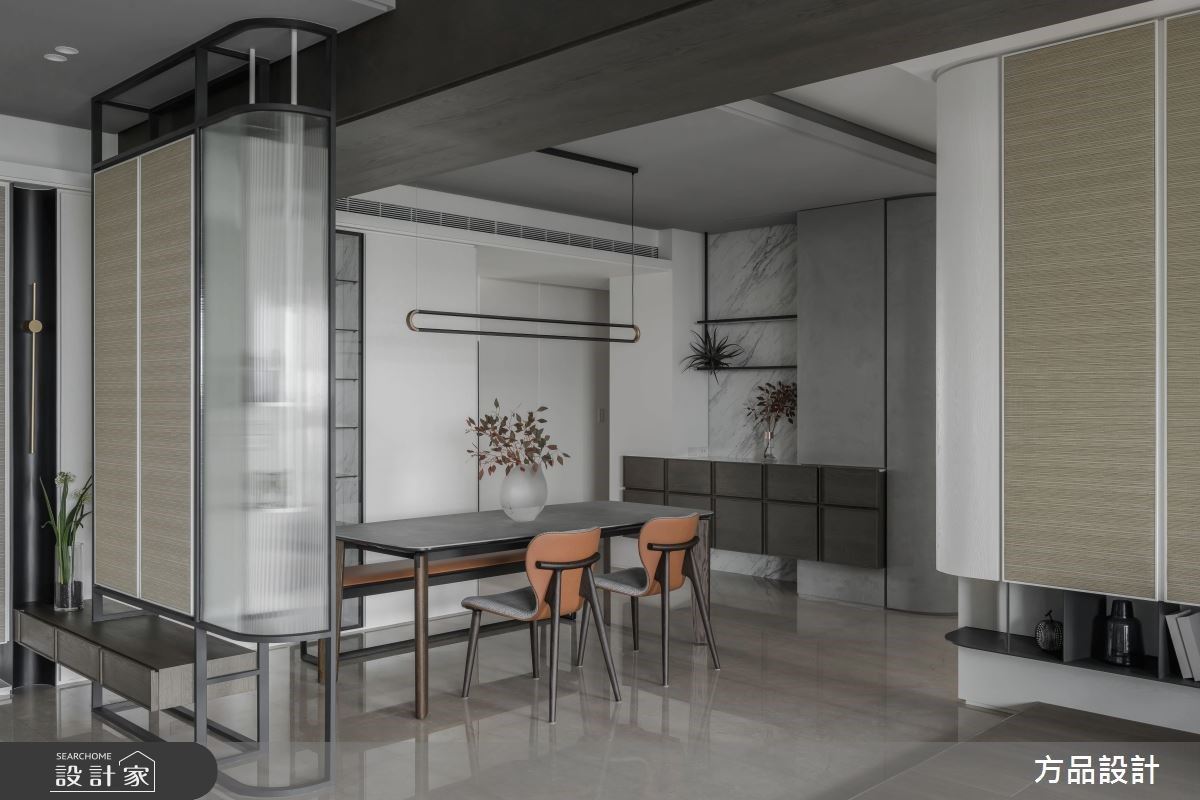玄關廊道選用灰色磁磚明確落塵分野,大門處的櫃體兼具屏風作用,確保隱私又能滿足收納需求。玄關盡頭的穿鞋椅與長虹玻璃屏風銜接,視覺輕盈優雅,也能避免開門灶的風水疑慮。客廳電視牆為推拉門設計,將牆體推開,後方隱藏著大量收納,巧妙兼顧空間美學與實用機能。電視牆側邊透過相似材質調和通往私領域的入口,視覺上更有整體感。