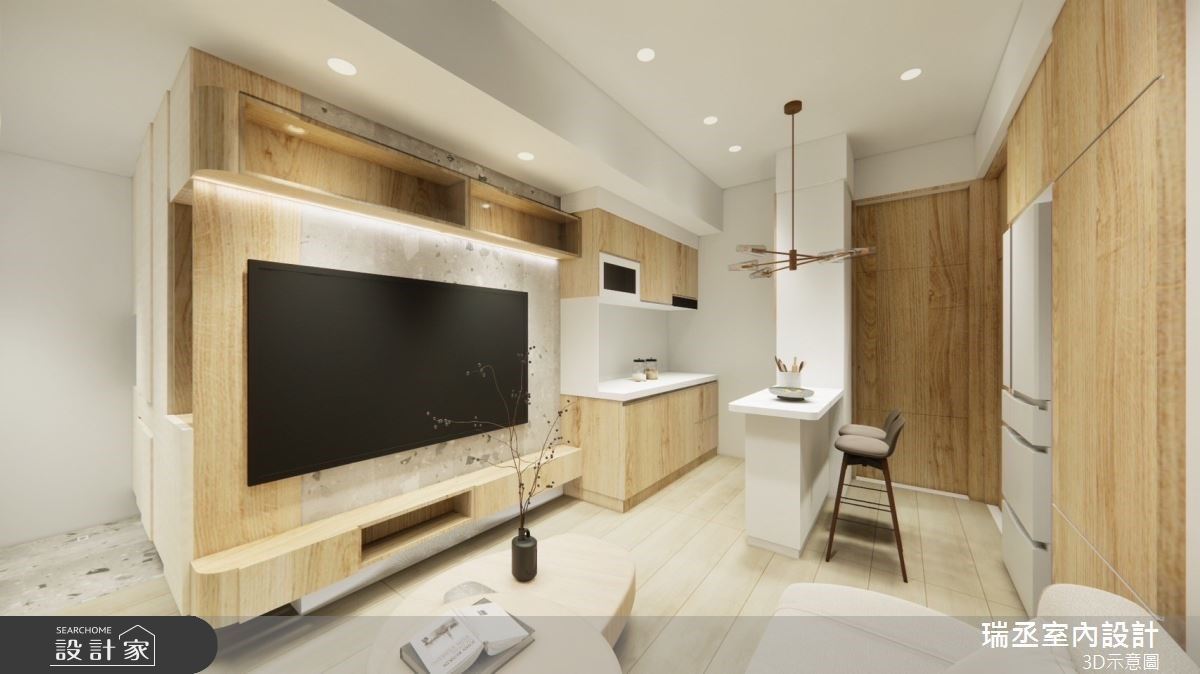 23坪的室內空間根據屋主需求重新梳理格局配置,由玄關起始,先將牆面向後推移,將玄關與廚房整併,破解空間的封閉感,也讓動線變得更寬敞、順暢。居家內部的色彩,選用素雅的淺灰色鋪陳,細膩的紋理層次內斂優雅,同時也在色彩心理學的輔助下,讓空間感變得更寬敞。客廳電視牆利用樑下空間規劃出下凹的畫面,巧妙集中視線,一旁的百葉窗提升光線的調整彈性,提升隱私性,也讓採光擁有更多元的選擇。沙發背牆以白色石紋點綴,空間更優雅可人。經過重塑格局的餐廚空間,空間、動線皆變得更寬敞,魏總監將電器櫃與冰箱整併,視覺上更有整體感,外推的機能也達到分流動線的效果,使用效率悄然提升。半開放式書房以玻璃分隔,通透的視覺效果,讓書房在獨立的同時,保有互動性與通透感,也巧妙地將光線引入無對外窗的廊道中。