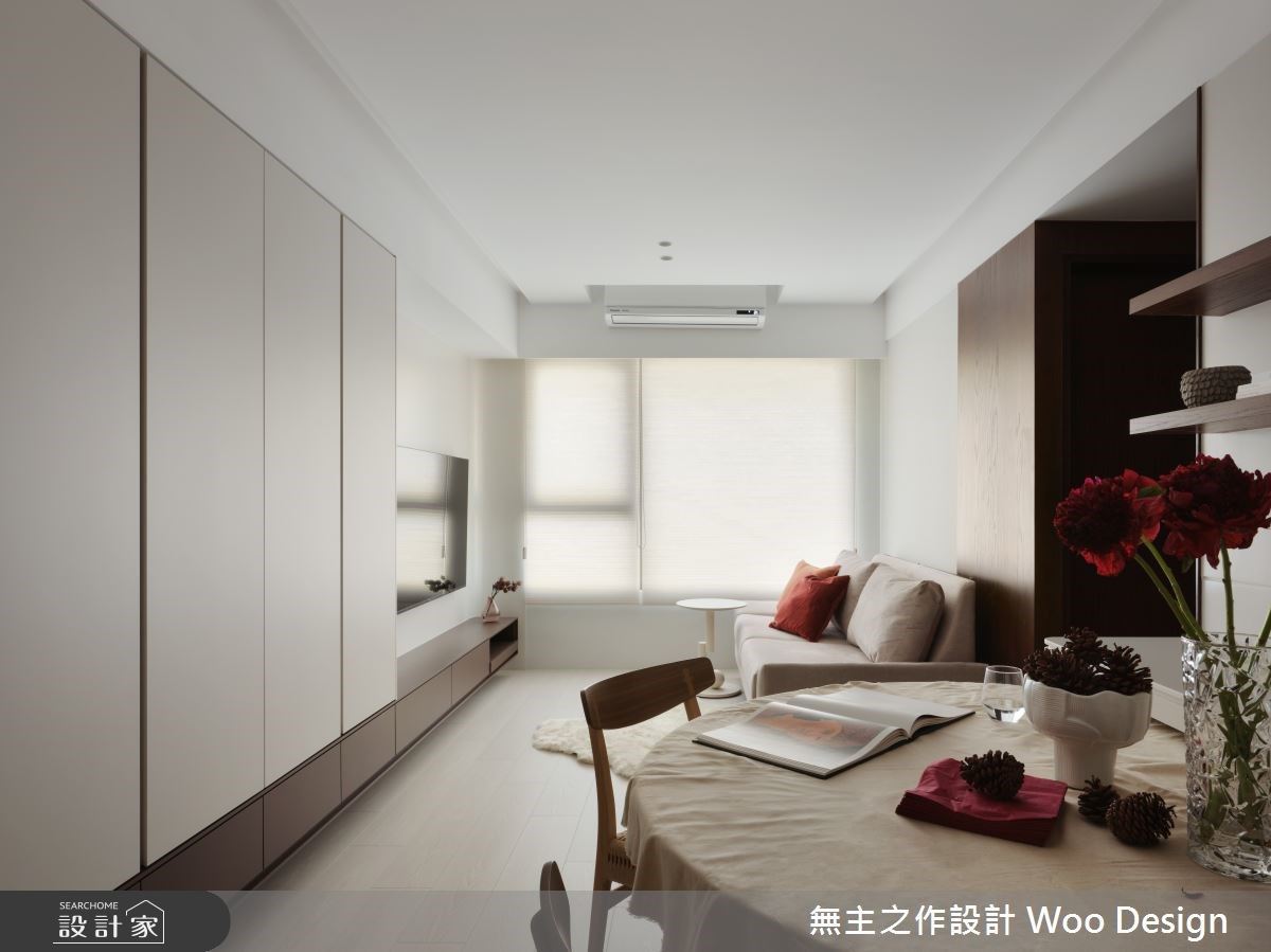 玄關將收納機能內推至落塵區外,保留寬敞舒適的進門尺度,同時梳理出清晰流暢的入室動線。走入公領域,木地板自然銜接而下,為整體空間鋪陳出溫潤質感。考量室內僅17.53坪,設計上採取通透的開放式概念規劃,不僅有效放大採光面,也讓空間感更加清爽輕盈,並提升通風效率。客廳與書房之間以半高牆劃分場域,清楚界定機能,同時透過與書桌相連的設計手法,避免積塵死角,也巧妙遮擋桌面視線,使視覺更整潔。書房收納則整合於背牆,透過虛實交錯的櫃體設計,化解頂天櫃的壓迫感,既保留良好採光,也兼顧實用收納需求。