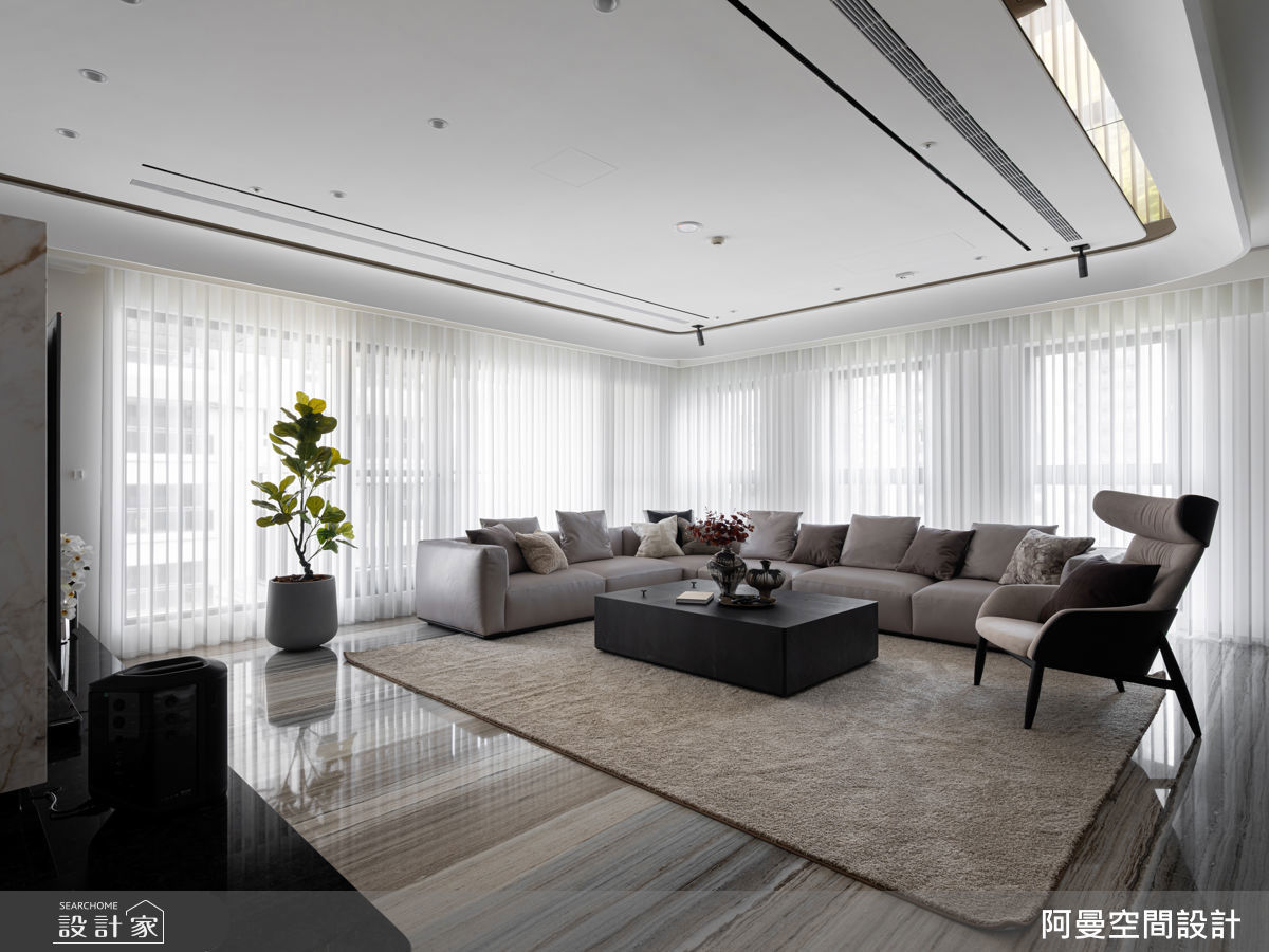 一樓的迎賓玄關,是留白語彙的純粹體現,天、牆以純白鋪展,為視覺留出呼吸餘裕,電子壁爐與內嵌線燈若隱若現地點亮細節,引導來訪者的目光向內延伸。盡頭牆面選用原石鋪陳,自然肌理在重點照明的映照下更顯鮮明,形塑出如洞穴般深沈寧靜的氣息,而B&B Italia 經典的 Serie Up 2000 單椅安放其間,為玄關注入一抹具象又感性的藝術姿態。客廳坐落於建築的第二層,暖白色調輕輕鋪展,如同晨光灑落般溫柔,設計師以一件件精選的精品家具構築畫面,不僅完善日常所需機能,更賦予空間細膩而大器的當代美學。電視牆以深邃黑跳脫主色,透過高反差語彙勾勒視覺重心,亦巧妙地調和了設備的存在感,使立面更顯純粹俐落。光影的安排摒棄了傳統直白的照明方式,取而代之的是溫潤的光源語彙,暖光造型燈與內嵌線燈交織層疊,於空間之中緩緩流動,營造出一方靜謐。餐廚空間延續整體俐落純粹的語彙,透過內嵌式家具與系統櫃體的整合,於視覺與功能之間取得優雅平衡。木質餐桌與中島銜接,異材質碰撞,在細膩的觸感與視覺節奏中,交織出豐富表情,實用之餘更蘊含著對生活美學的深層詮釋。