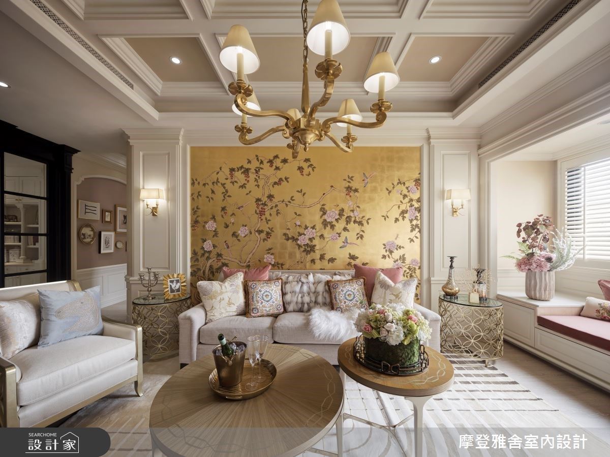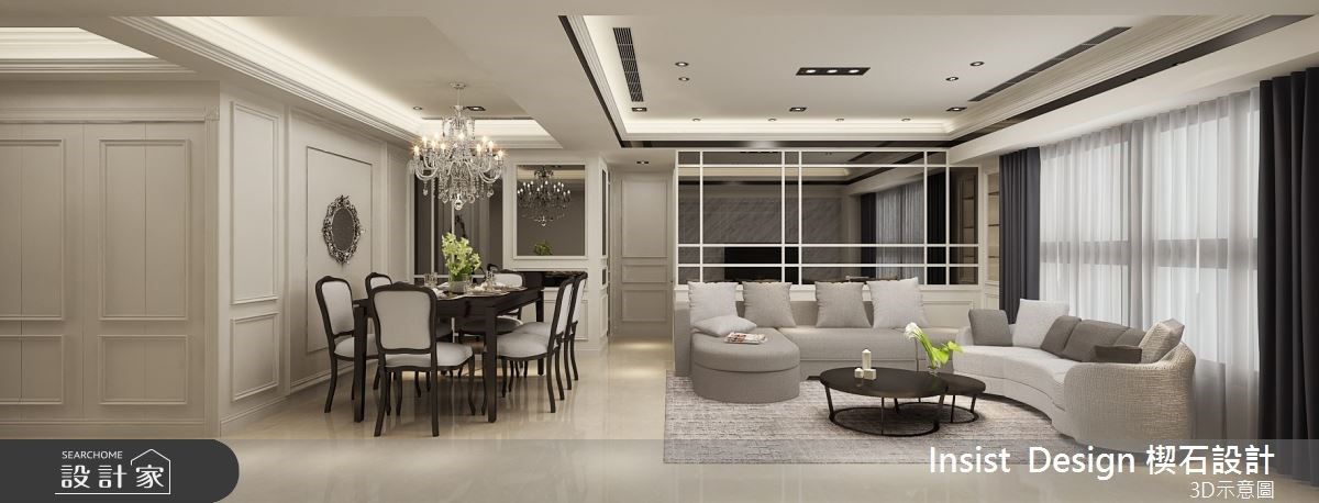在公領域規劃部分,因屋主不需要餐桌機能,設計師將吧檯區幻化為優雅精緻的生活端景,以簡約的方型鐵件結構承托著安格拉珍珠大理石;後方餐櫃則結合了線板與卡拉拉白大理石,再搭配廚房的水波紋玻璃材質,營造出浪漫雅緻的風格氛圍。