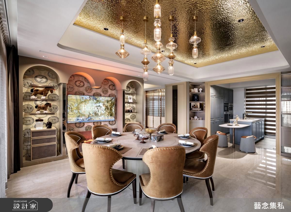 餐廳區域則以一張圓型餐桌為中心,水晶吊燈懸掛其上,彷彿冰晶般灑落微光,讓每一場用餐都與浪漫不期而遇。其側為開放式廚房與中島串聯,金色吊燈錯落懸掛,映照黑灰主調與修飾大樑的光帶,輕柔地說著低調而極致的奢雅語言。