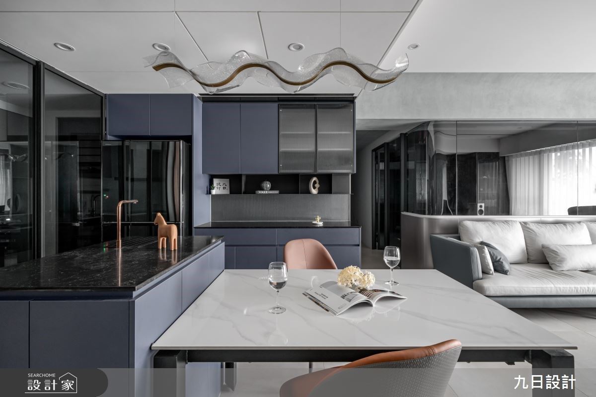 玄關區佇立一道白色鐵件玻璃屏風,隱蔽了進門後的視線直視,也巧妙化解穿堂煞的風水問題,更自然地劃分用餐區的範疇。開放式的餐廚空間設定於居家的核心,可以隨時與另一側客廳進行對話互動,中島吧檯結合純白大理石紋理和時尚黑調,展現時髦優雅的空間質感,也成為屋主平時最愛的生活聚點。