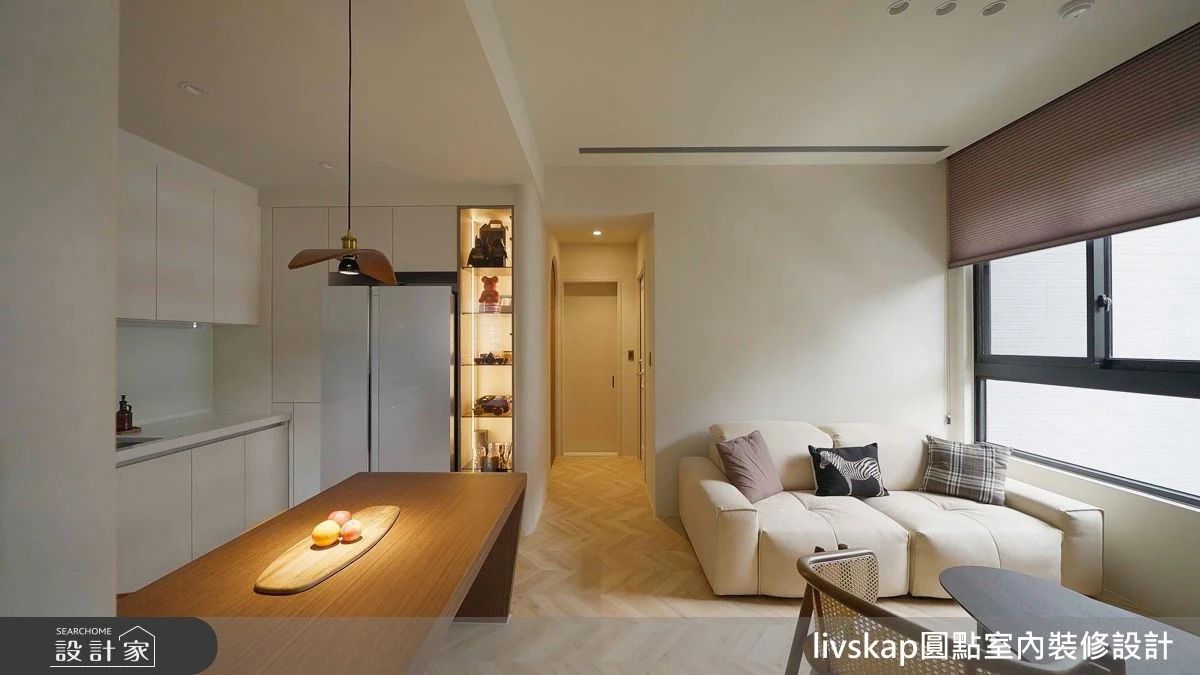 在僅約16坪的室內空間裡,陳錦墩設計總監與陳冠廷設計師為一對年輕新婚夫妻打造一處溫潤簡約、兼具日常機能與風格美感的小宅。透過細膩的格局調整與質材選配,不僅放大了小宅的尺度感,更巧妙地融入屋主生活經驗與風格偏好,實現了理想中的「簡單而有溫度」的日式居家風貌。 原本格局為標準小宅配置,玄關右側為封閉式廚房,冰箱與爐灶正對,在風水與動線上皆不理想。設計師藉由將廚房轉化為開放式餐廚區,改把冰箱移至玄關旁,並將電器櫃設於靠陽台位置,大幅優化使用動線與空間流動,而中島與餐桌合併設計,不僅整合功能,也讓視覺感受更為寬敞明亮。