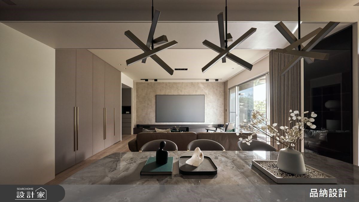 原始玄關為開放式設計,一入室便可以將公領域一覽無遺,同時也存在穿堂煞的風水疑慮。翻新後,設計師先利用懸浮系統櫃填滿樑下,再延伸出一座圓角矮櫃,既化解疑慮,也將收納機能最大化。進入公領域,深色系木地板奠定沉穩基調,而大幅留白的色彩規劃,配上局部點綴的木紋,簡約現代之中,又帶出一絲溫潤。客廳沙發背牆巧用木質與弧形元素暗示場域間的過渡,讓櫃體與牆面的高低落差包覆沙發,形塑溫馨的安全感。半高電視牆兼具書房隔牆機能,通透的視覺繫起場域互動,也讓光線自在流淌。開放式餐廚改以深色係鋪陳,一盞垂墜吊燈點綴餐桌,用餐儀式感瞬間升華,而寬敞的檯面,也讓烹飪聚會變得更加從容、舒適。