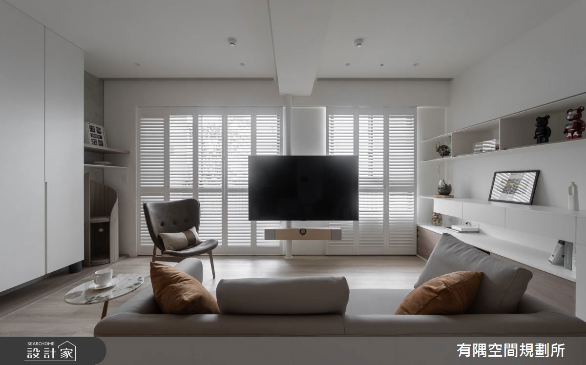 私領域以暖灰色調鋪陳,沉靜而平和。百葉窗微微濾光,使室內的光影變得溫柔而細膩。主臥的衣櫃收納量體充足,書桌順勢延伸成梳妝台,靈活應對日常所需。考量家中有年幼孩童,轉角細節以弧形收邊修飾,不僅提升了安全性,也讓空間多了幾分圓融與細緻。同時,設計師也關注到屋主生活的特殊需求。由於經常往返國外,行李箱的收納成為必要,於是利用畸零空間規劃出隱蔽的儲藏室,並順勢將結構大樑隱於其中,讓整體畫面更加和諧一致。