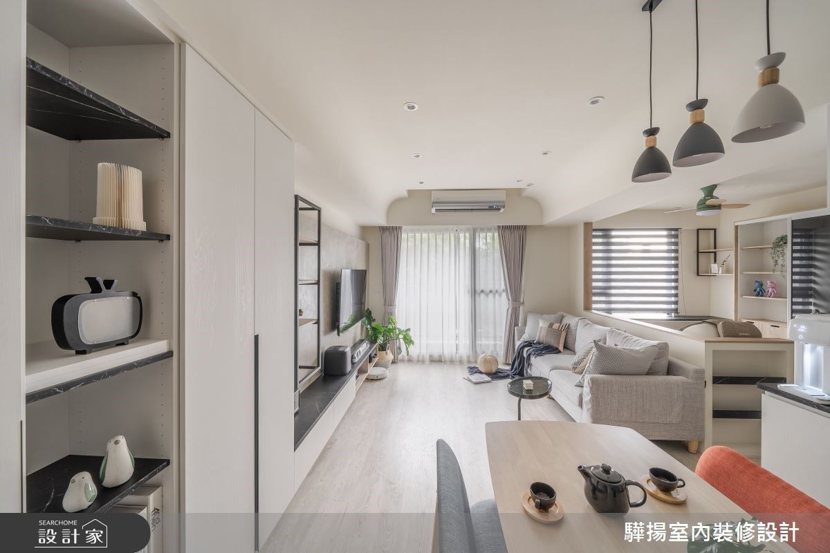 公領域採取全然開放佈局,以靈活流動動線,牽繫起玄關、客餐廳、開放式書房的複合關係。考量嬰兒車與自行車進出,玄關不規劃落塵區,而是放大出入動線,一進門便能感受到開闊明亮視野。鞋櫃沿牆而設,採上下櫃形式,中段鋪陳茶鏡,既映照景深,也拓寬視覺尺幅。角處以圓弧邊櫃銜接格柵壁板,嵌入壁燈端景,為晚歸的身影輕綴溫暖景序。另一側則順勢運用三角空間,於牆面貼覆可吊掛帽子與配件的洞洞板,機櫃同時兼作穿鞋椅,巧妙整合收納與機能。