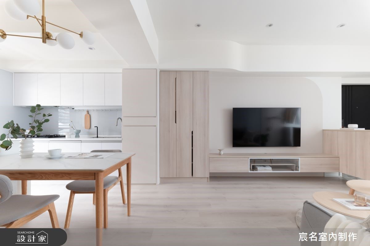 玄關鋪設地磚延伸至開放中島餐廚,與客廳的木地板劃分場域,洞洞板可靈活吊掛,結合圓柱平台收納鑰匙等小物,讓機能更實用,弧形牆面延伸到客廳電視櫃,視覺流暢也具有導引動線的效果,公領域盡可能放大,加深居宅縱深,以純淨的白色與溫潤木質,塑造明亮溫馨的氛圍,落地窗邊架高地坪形成低矮臥榻,也是閱讀放空的小天地,客廳後方巧思打造一處多功能角落,下層是書房,上層則像樹屋般的秘密基地,爬上樓梯後,能透過圓孔以不同角度欣賞客廳,讓空間多了份童趣想像。不僅如此,客廳天花板預留掛勾,可作為盪鞦韆或TRX運動使用,實現多元生活場景。以黑色塗料圍塑的開放式廚房,展現沉穩時尚的格調,中島串聯餐桌,構築靈活回字型動線,餐邊櫃升級為輕食吧檯,生活好Chill。