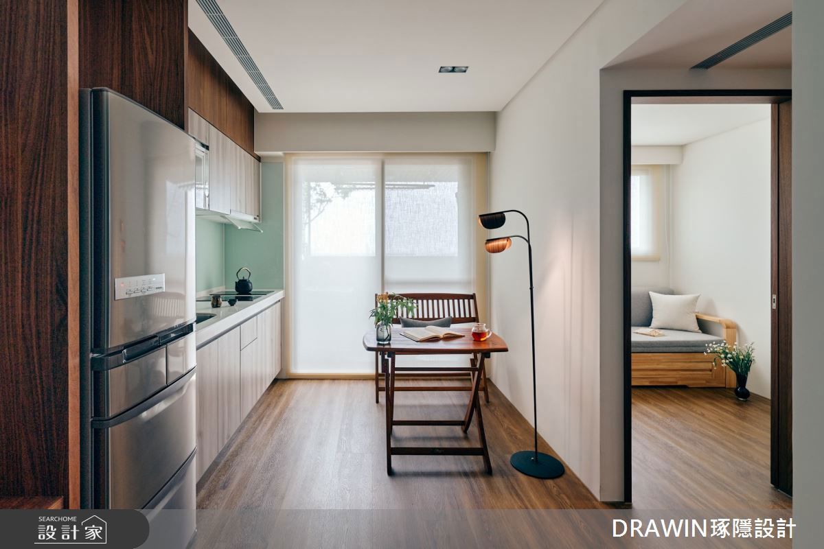 室內座位區動線佈局嚴謹,在有限的空間中,精準配置L型中島與兩張桌席。選用保留天然紋理的橡木餐桌,邊緣特別做了圓弧倒角處理,降低銳利感並提升使用的舒適度;上方懸吊的和紙燈,投射出溫潤的光暈,營造出一股安穩氛圍。