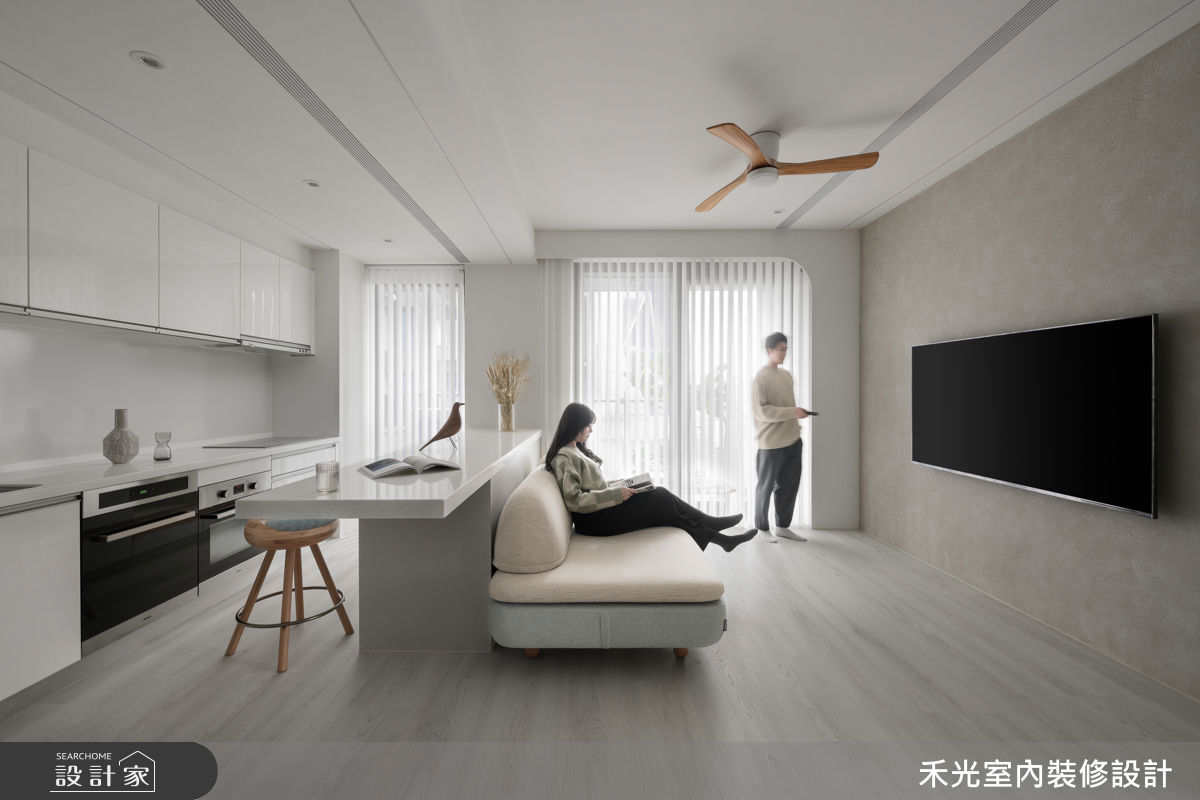 玄關由灰色瓷磚界定分野,木色櫃體嵌入牆中,銜接處的稜角以弧形語彙修飾,與地坪分界呼應,在灰色基底的襯映下,注入溫馨暖意。公領域成開放式設計,藉由天花高低、半高牆暗示機能的轉換。客廳設計跳脫傳統電視牆配置,改以投影布幕由天花垂墜而下,兼顧觀影與空間使用彈性。開放式餐廳以一張木質餐桌搭配長凳,擴增使用人數,也銜接起場域間的互動性。